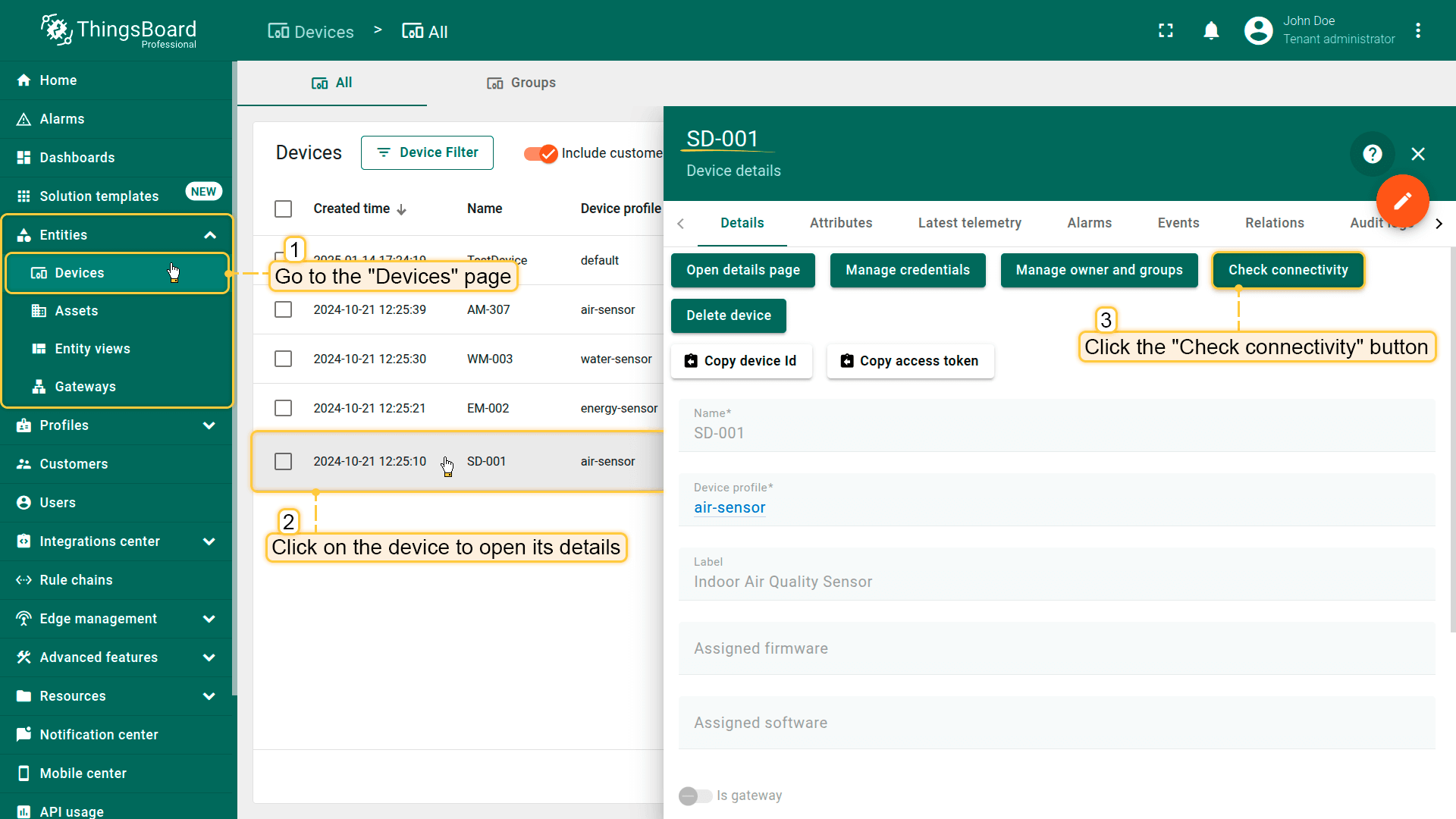 - Go to the "Devices" page. Choose the "Indoor Air Quality Sensor" device and click the "Check connectivity” button in the "Device details" window;