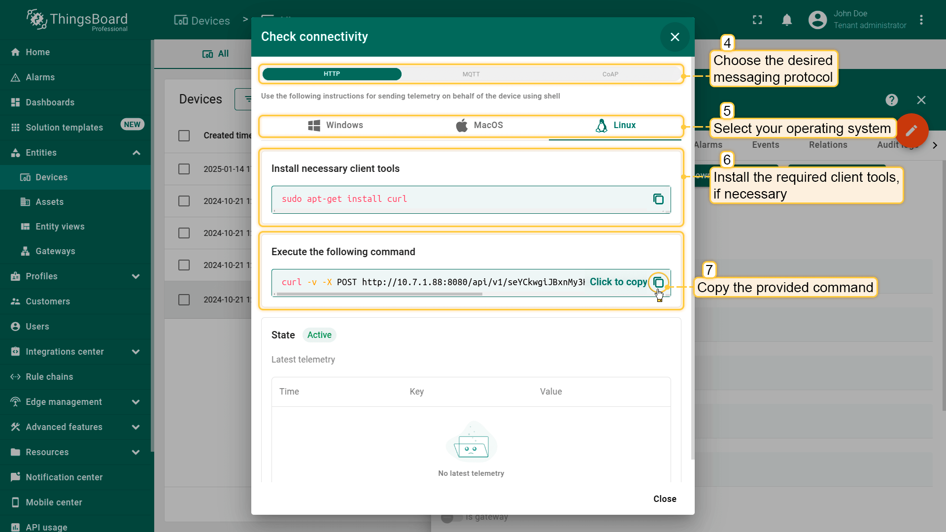 - Open the Terminal and paste the copied command. This command will send a POST request to the IoT Hub server with the {"temperature":25} data. Execute this command. After successful execution, the "temperature" reading will be published. Then, close the connectivity window.