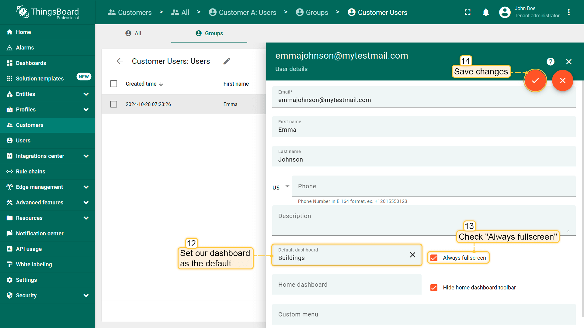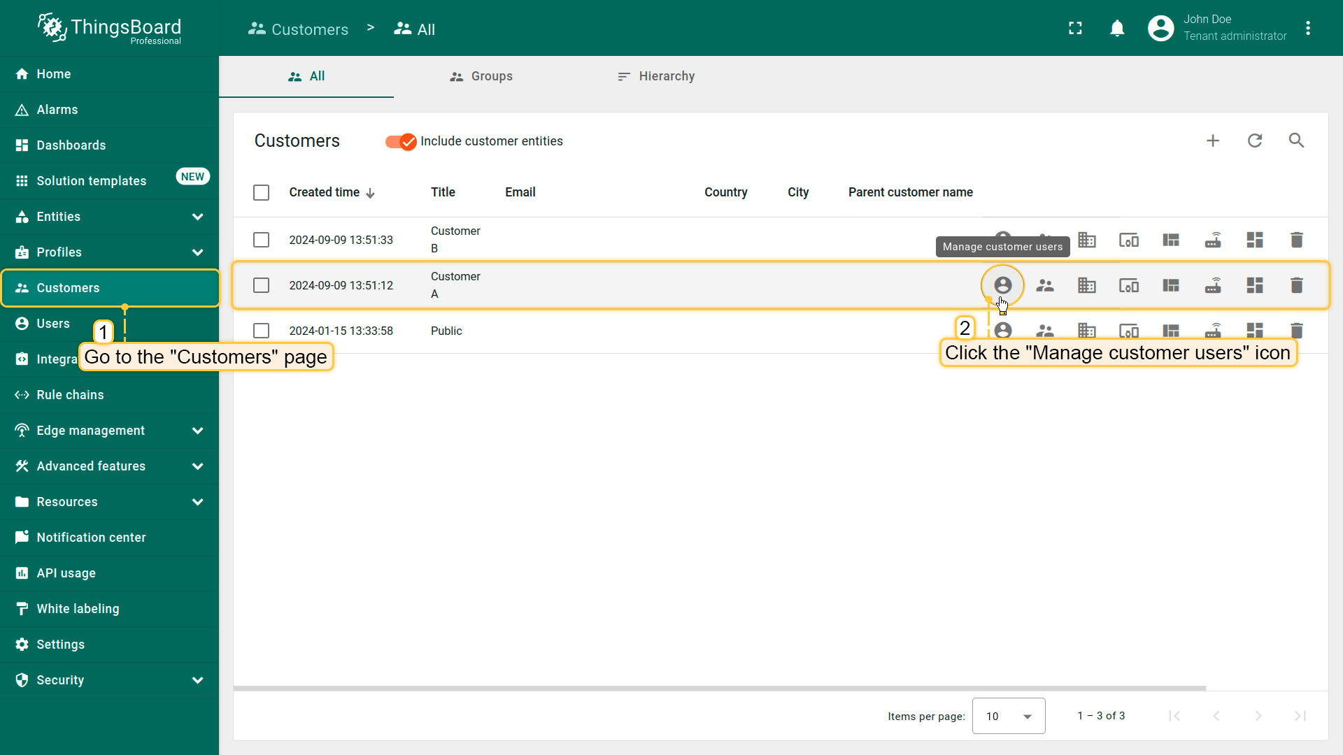 In this lesson, we will add two customers and configure shared access for them to the dashboard created in previous lessons. In our case, a Customer is an individual or organization that rents an office in your building and uses the devices available there. Each customer will have access solely to their respective rented office and the devices within it.