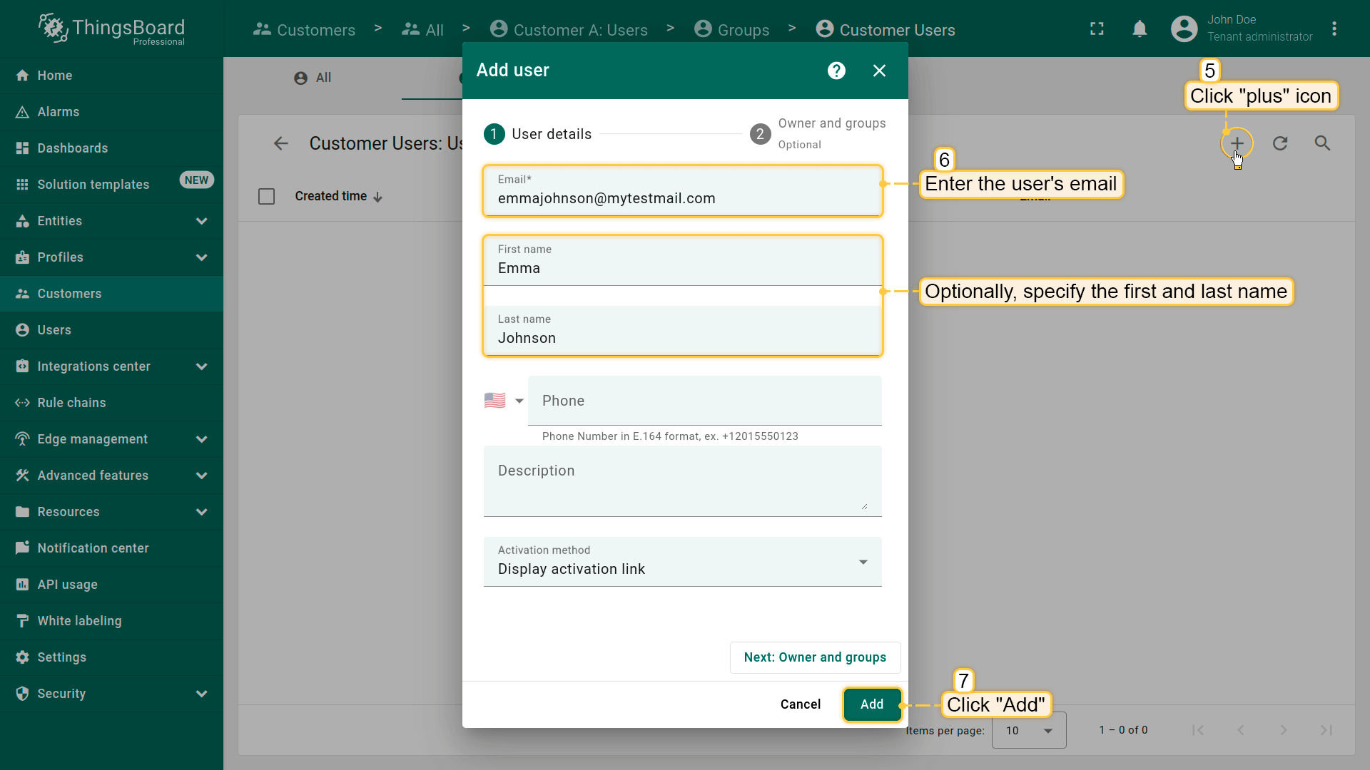 - Click “plus” icon in the top-right corner. Enter the user's email. Additionally, specify the first and last name. Then click “Add”;