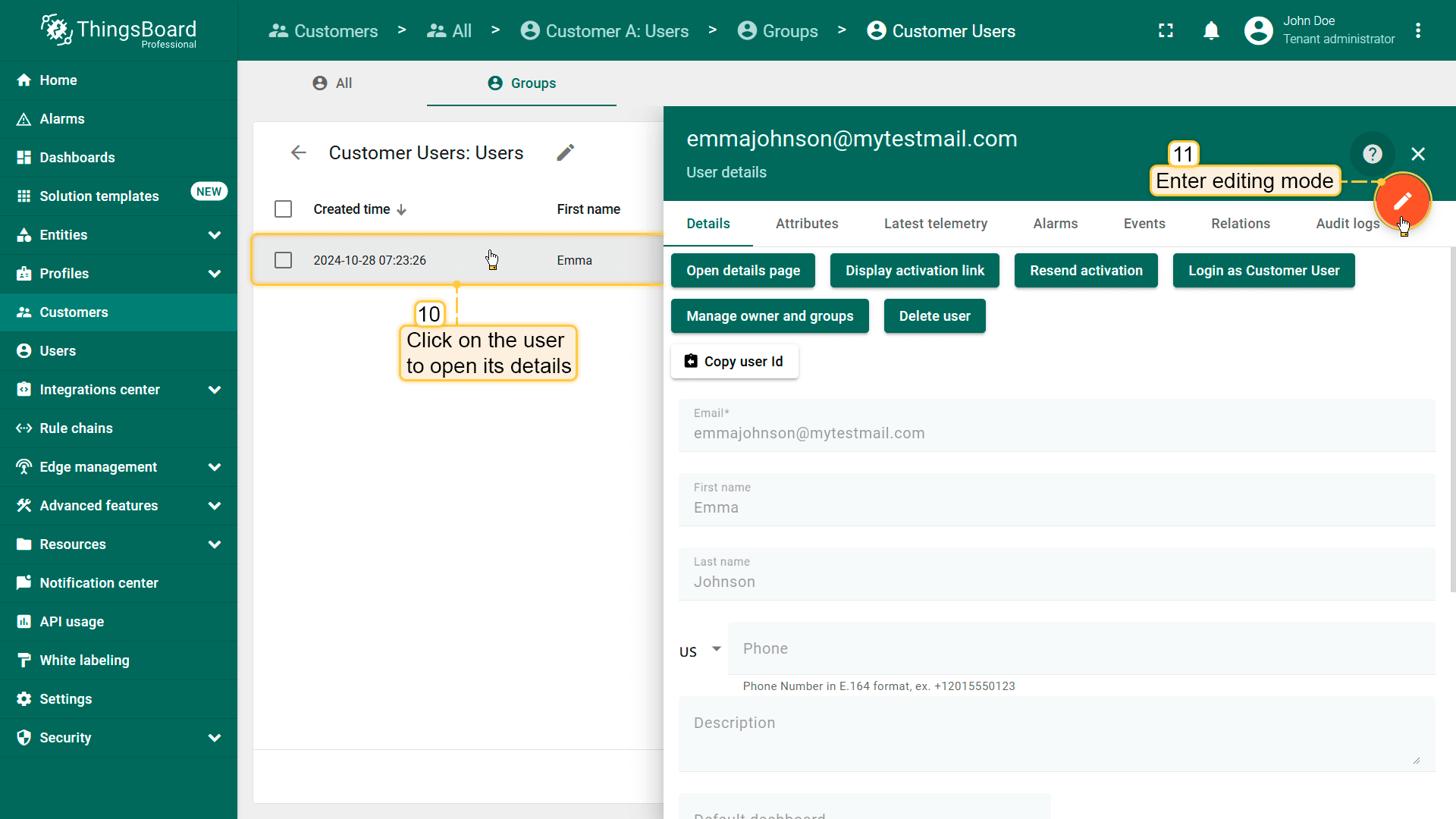 - We added new customer user. Click on the created user to open their details, then click the big orange “pencil” icon to enter editing mode;