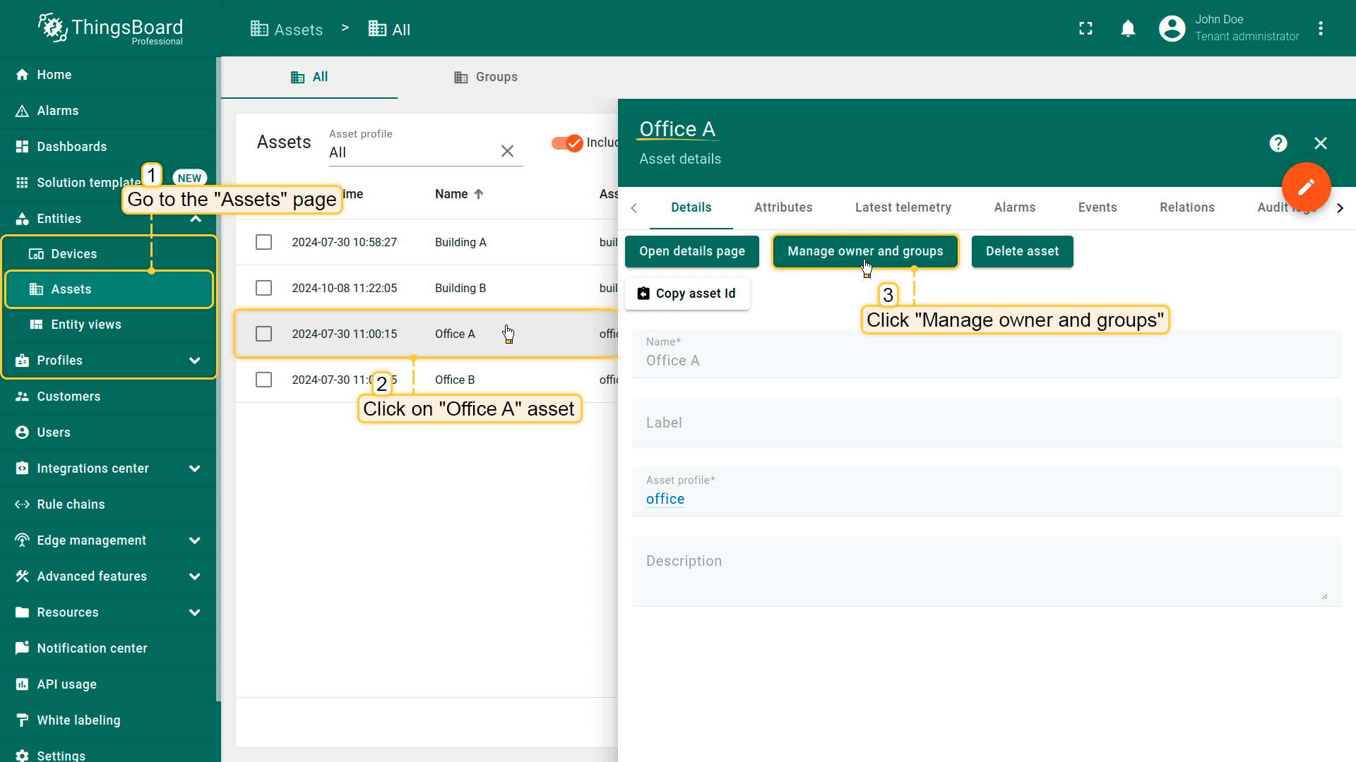 - Navigate to the "Assets" page. Open assets details by clicking on the "Office A" asset. Then click "Manage owner and groups" button;
