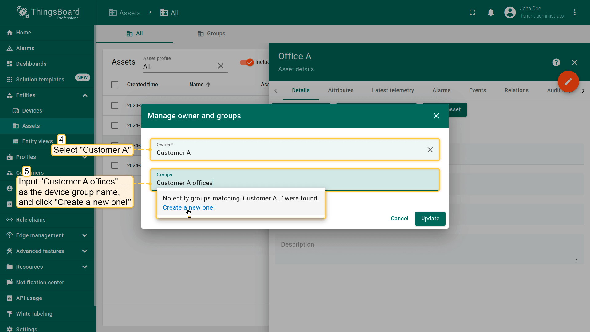 - Specify Customer A as the asset owner. Then, add "Office A" asset to the group. Input the desired device group name, for example "Customer A offices", and click "Create a new one!";