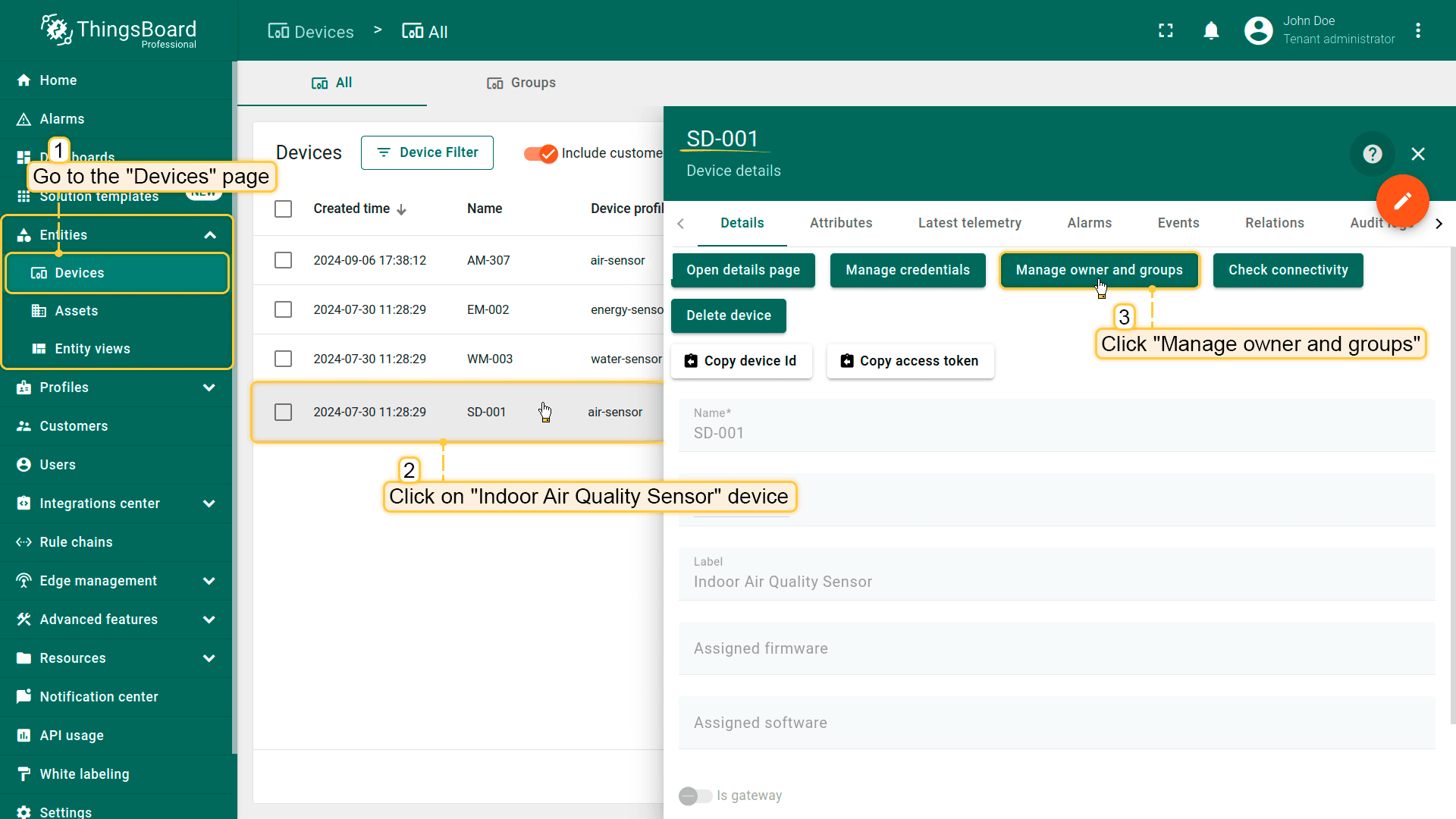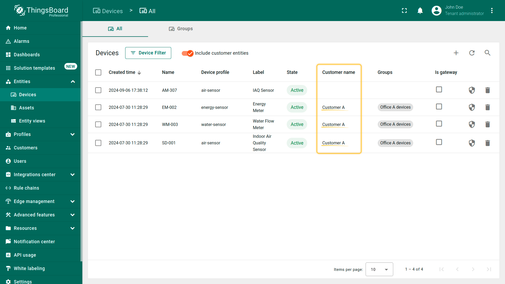 Now, let’s change the owners of the devices. Assign Customer A as the owner of all devices in Office A, specifically: “Indoor Air Quality Sensor”, “Energy Meter”, and “Water Flow Meter”. Assign Customer B as the owner of the “IQA Sensor” in Office B.
