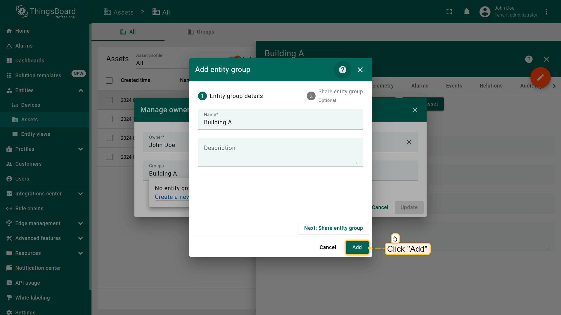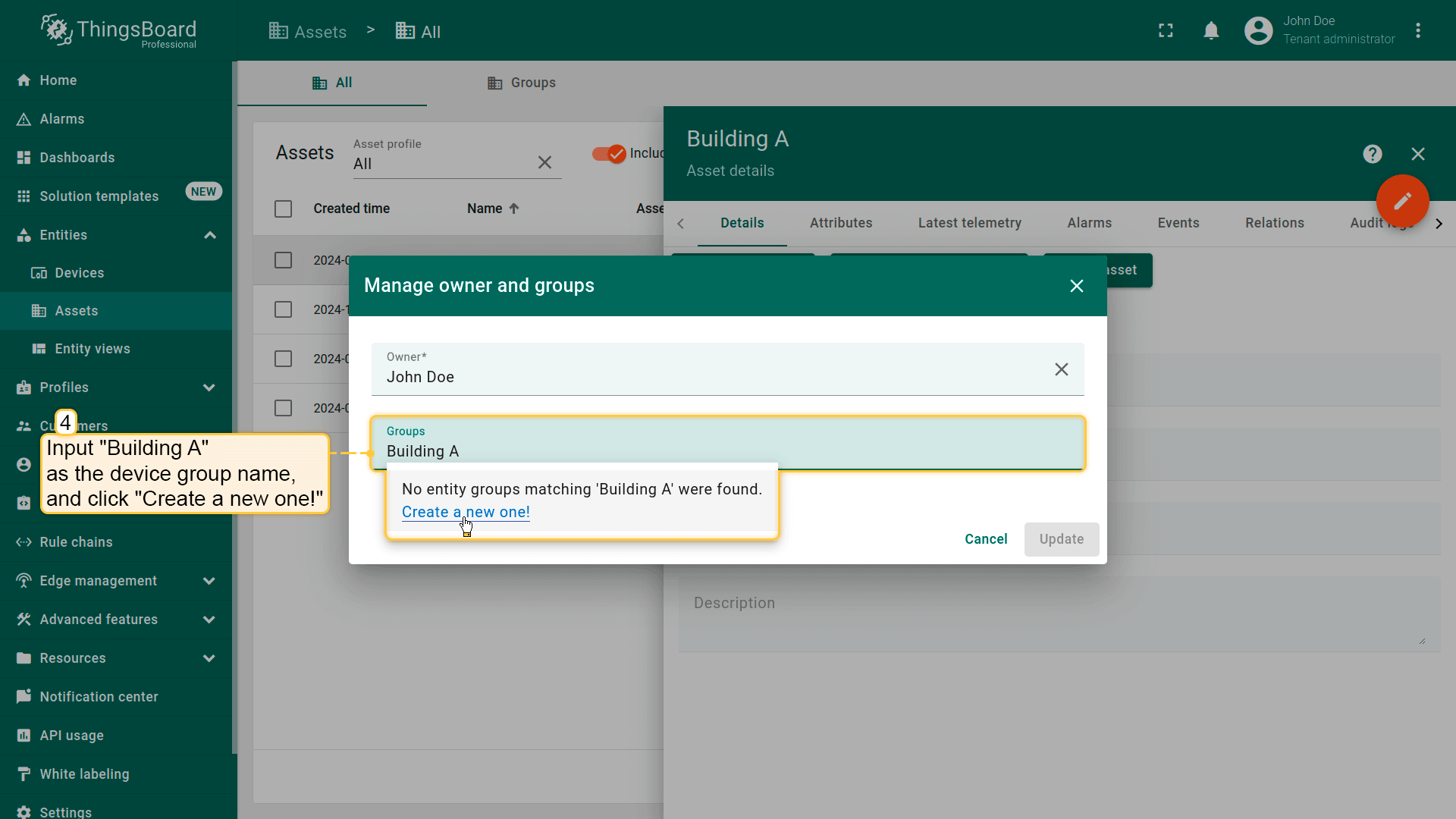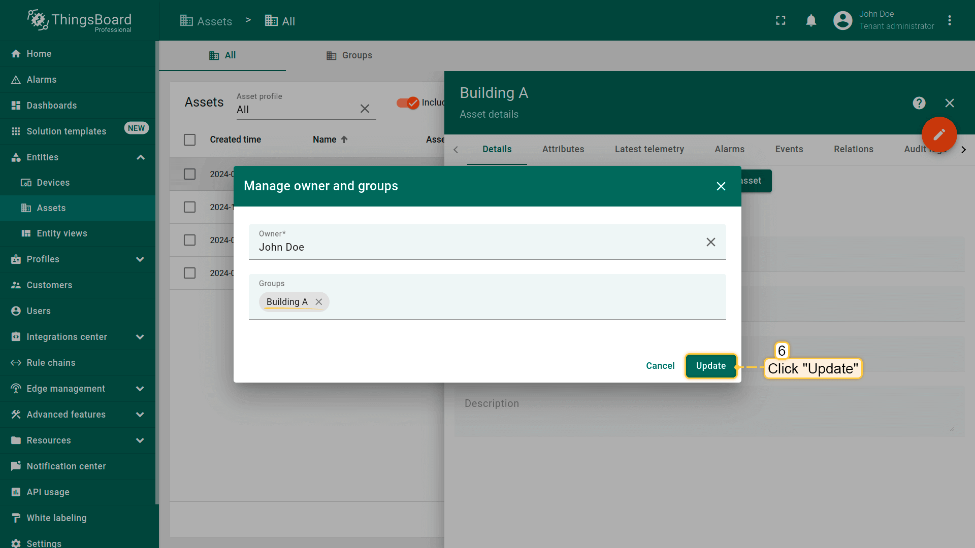 - Go to the "Assets" page and click the "Manage owner and groups" button in the details of the "Building A" asset;