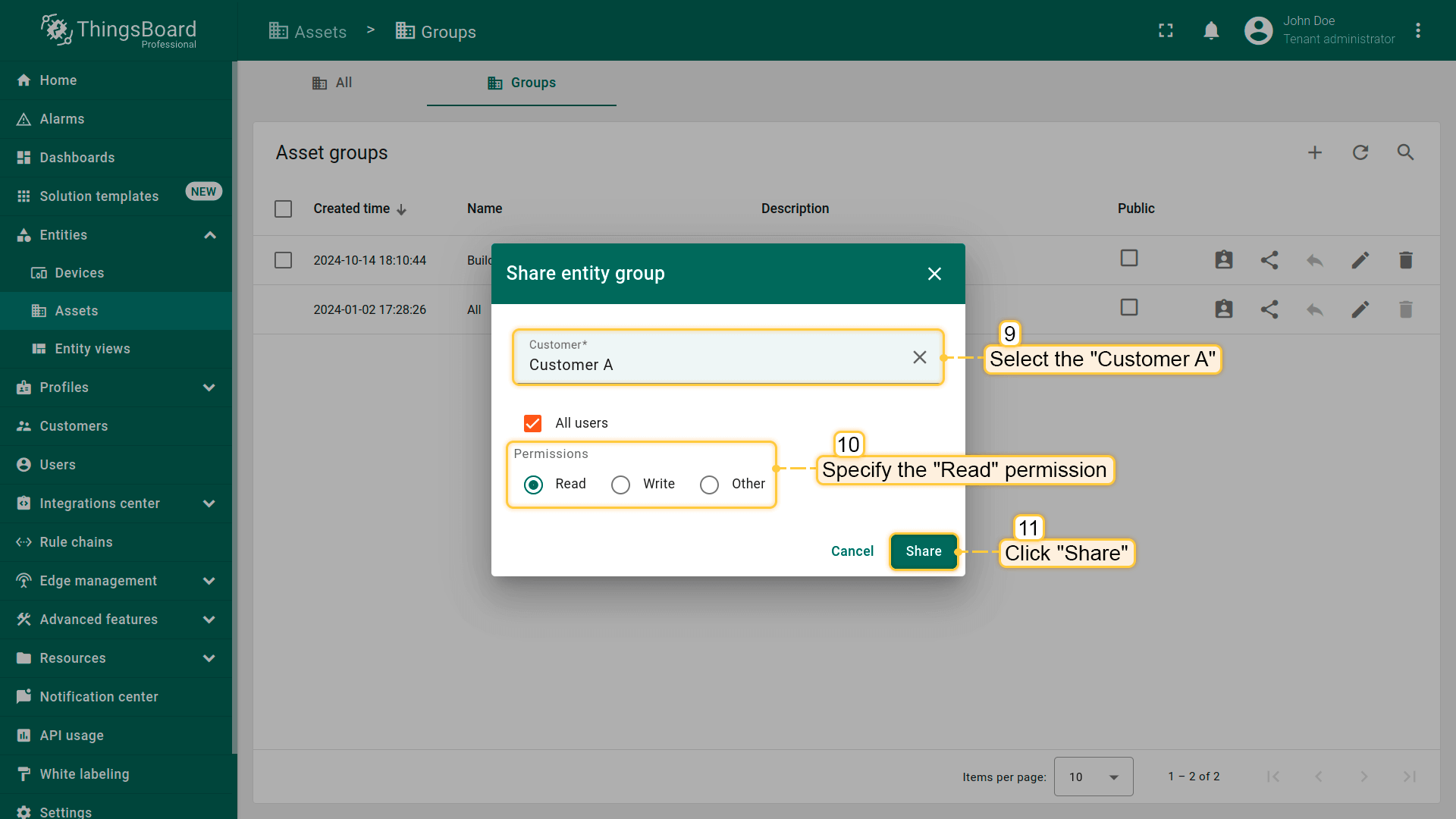 There are two ways a Tenant Administrator can grant a Customer access to a specific entity (such as a Device, Dashboard, Asset, etc.):