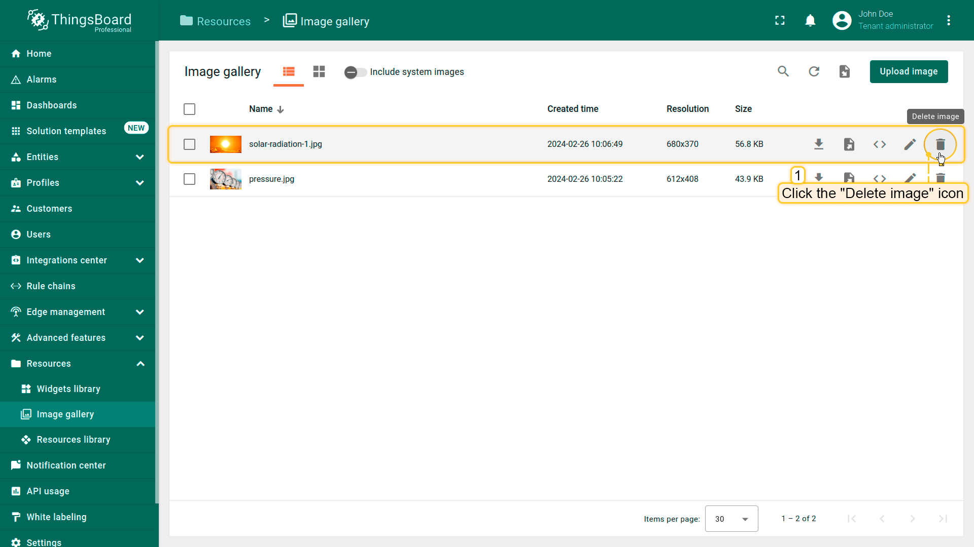 - Click the "Delete image" icon opposite the image's name you want to delete;