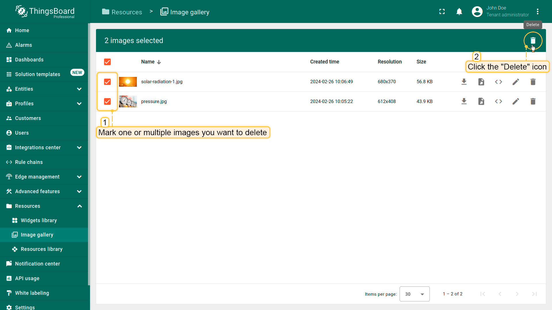 - Mark one or multiple images you want to delete. Click on the "Delete" bin icon in the top right corner;