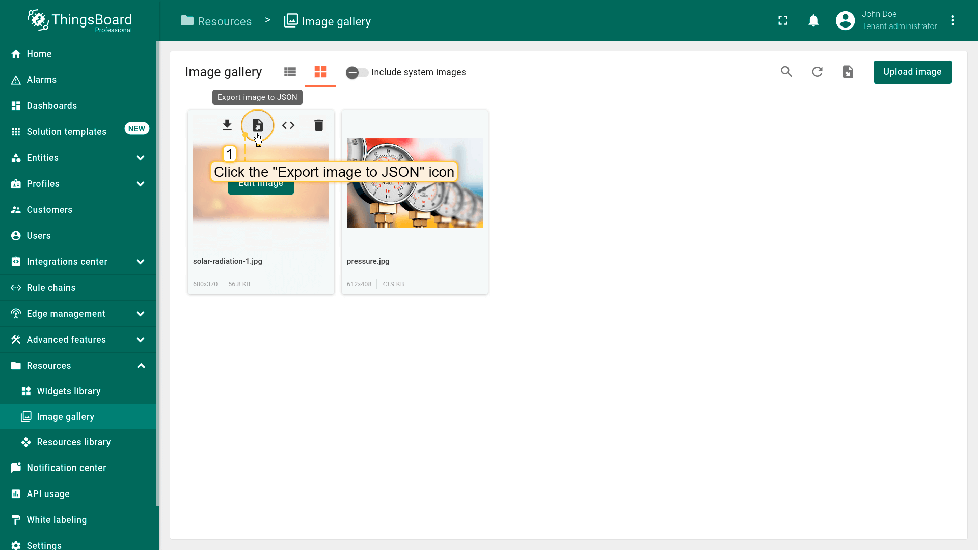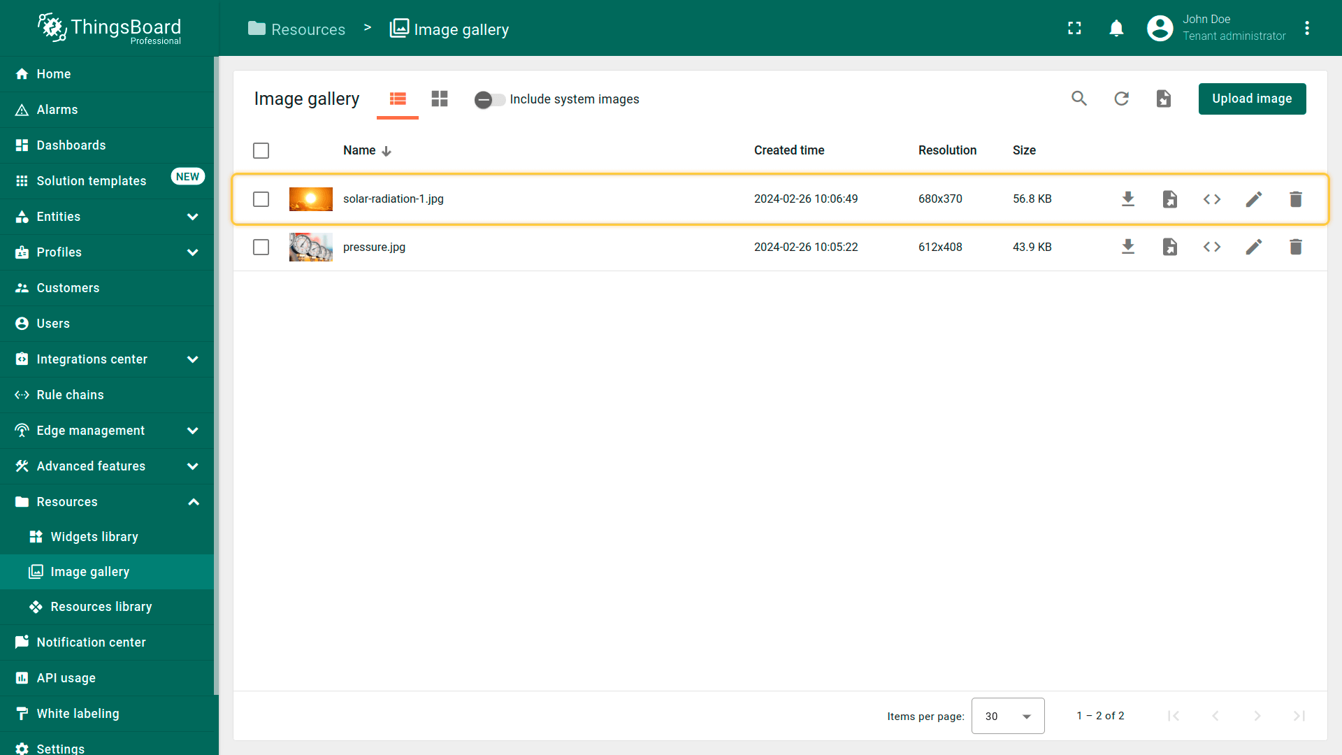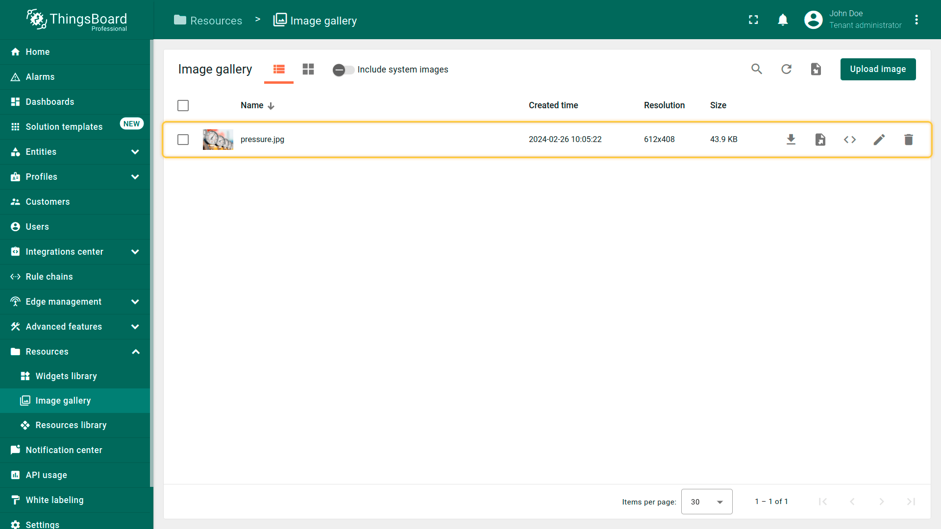 The Image gallery serves as a centralized repository for storing and managing images. This is an important resource for improving the visual appeal and functionality of widgets, dashboards, devices, and asset profiles in a mobile application. Users can easily upload, organize, and select images to customize their interface and user experience, ensuring an integrity and branded look across the platform.