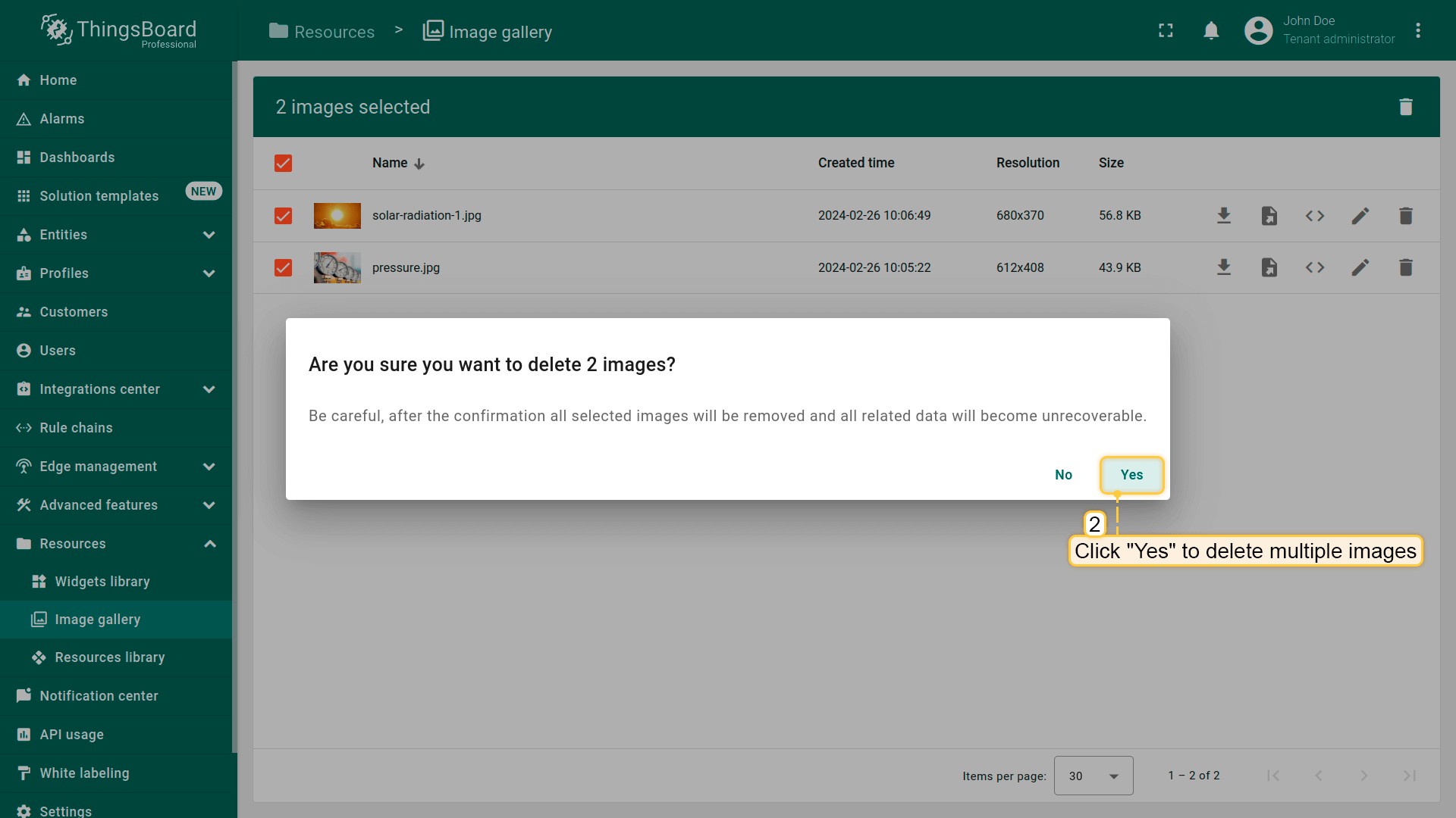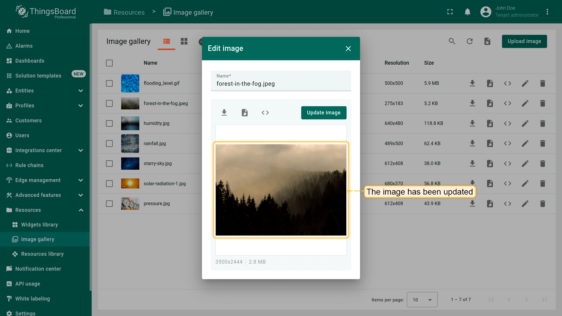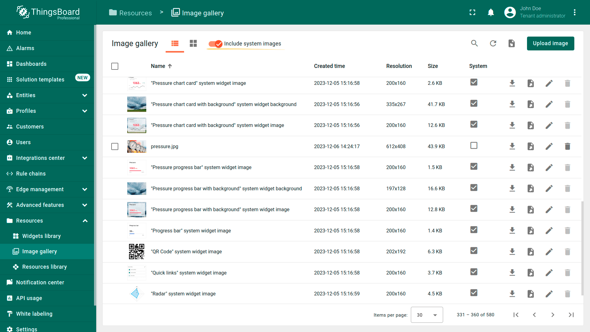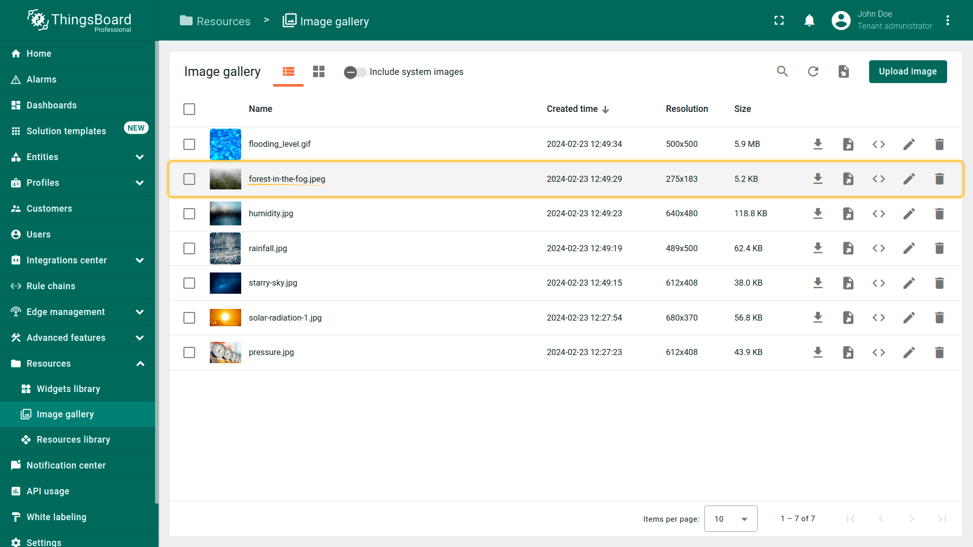 The Image gallery serves as a centralized repository for storing and managing images. This is an important resource for improving the visual appeal and functionality of widgets, dashboards, devices, and asset profiles in a mobile application. Users can easily upload, organize, and select images to customize their interface and user experience, ensuring an integrity and branded look across the platform.