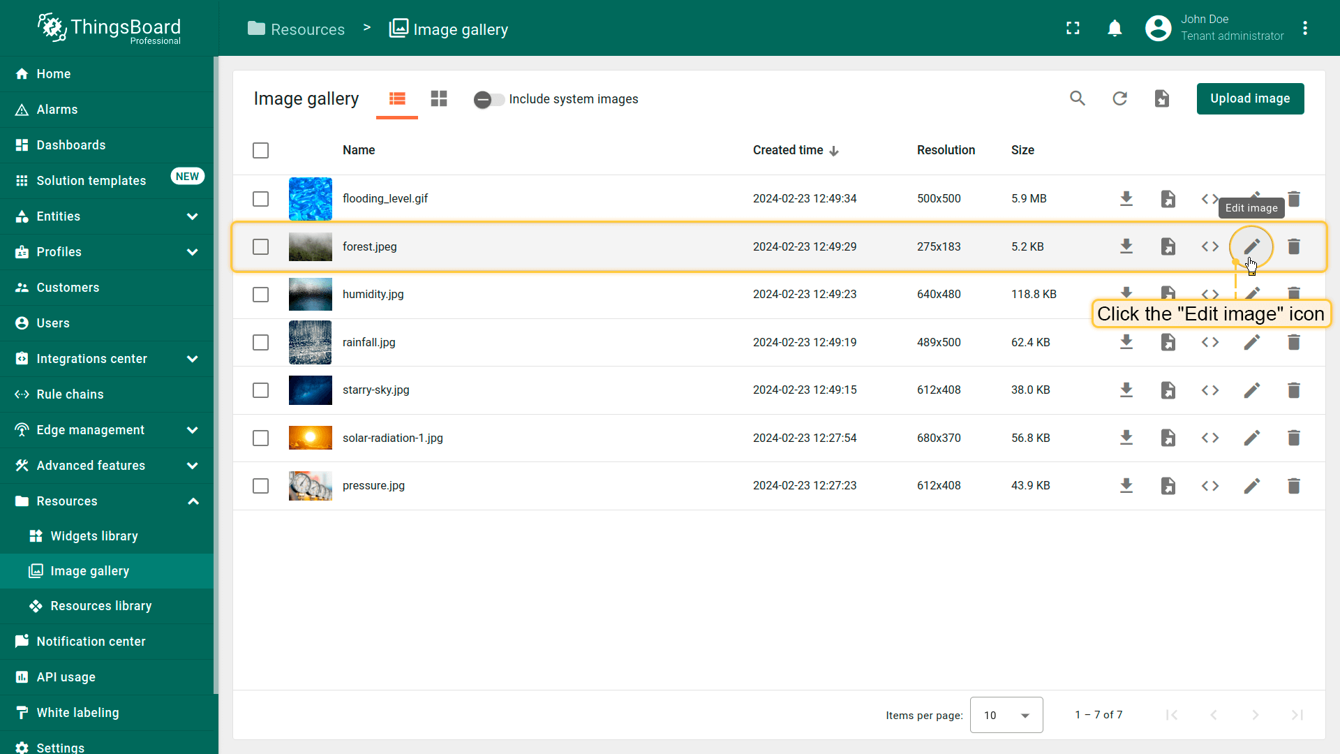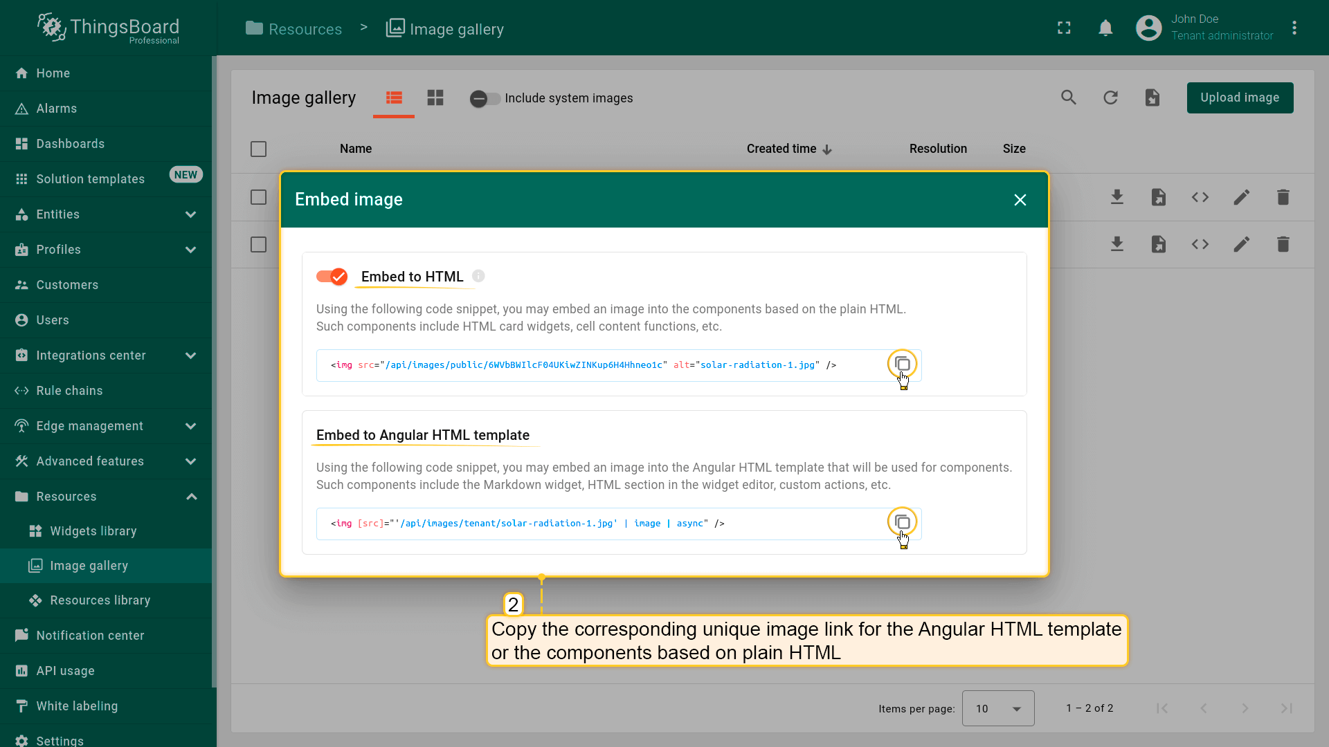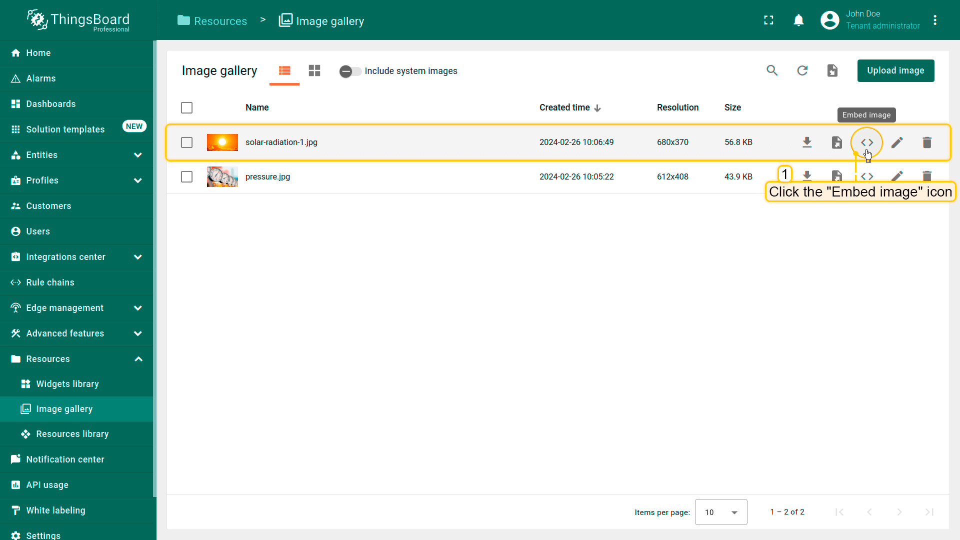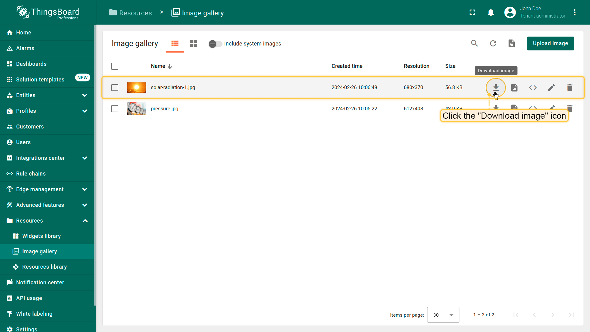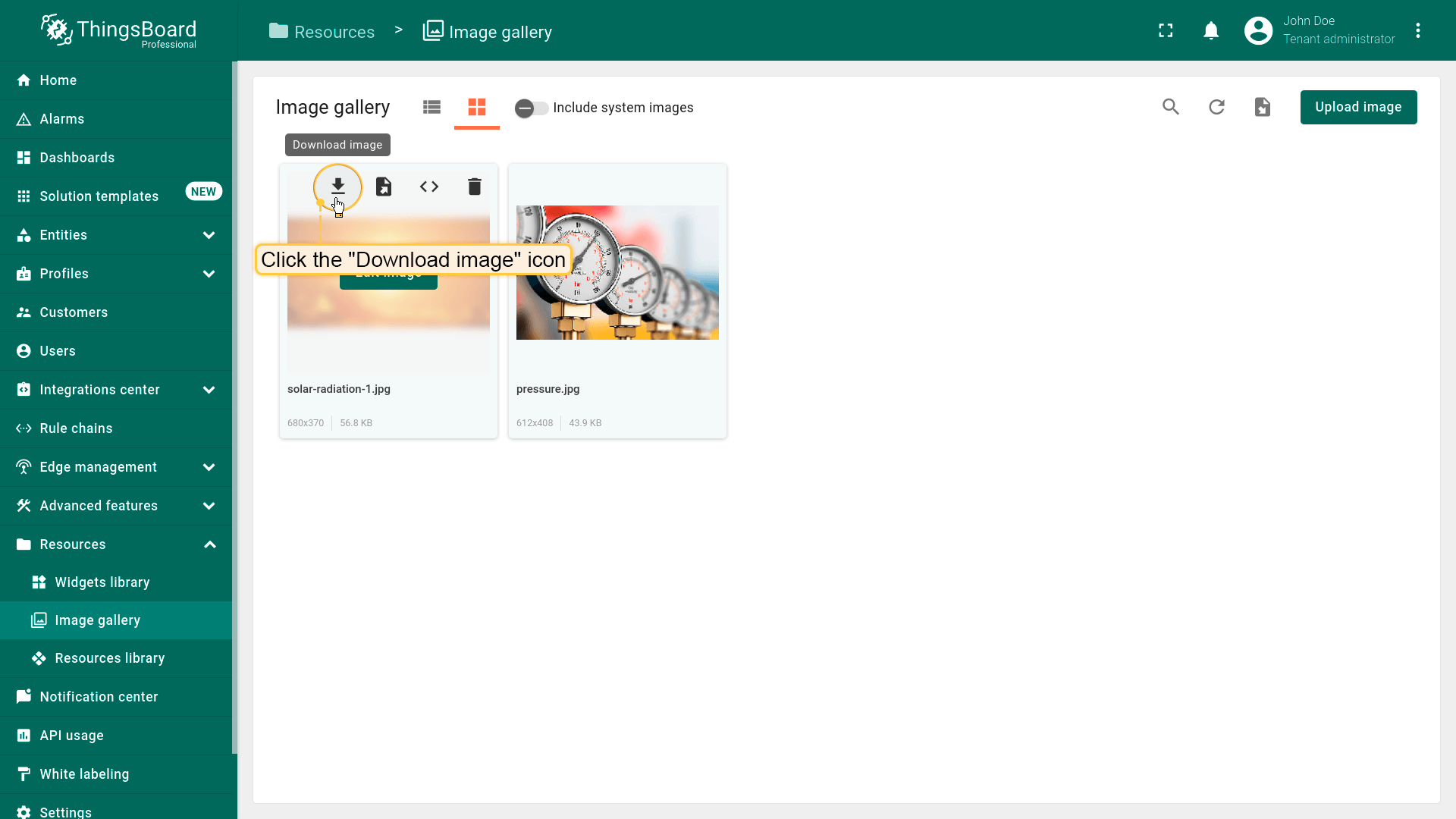 Images provided at the system level are available to all users using the platform, while tenant images may only be available to specific tenants. Each image on the IoT Hub platform has a unique URL that allows you to download the image both with and without authentication.