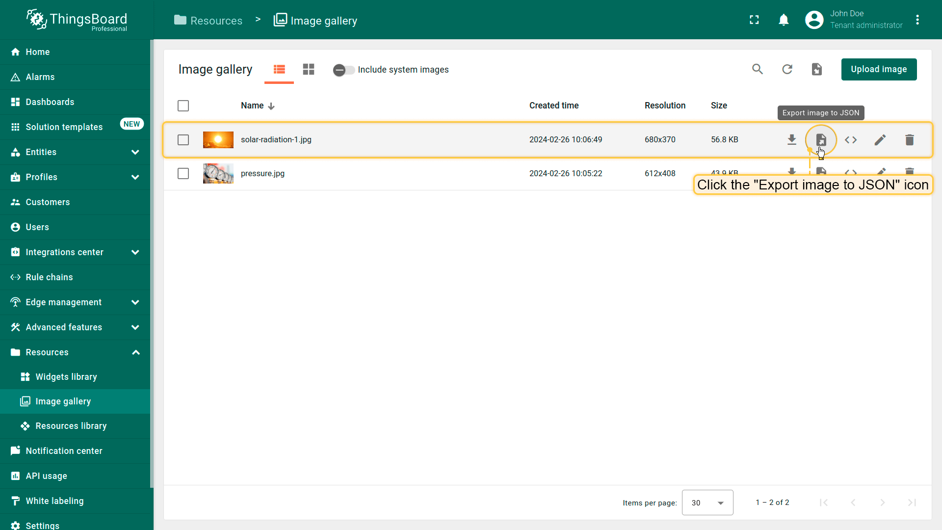 - If you’re using the list view of images, click the “Export image to JSON” icon next to the image name that you want to download.