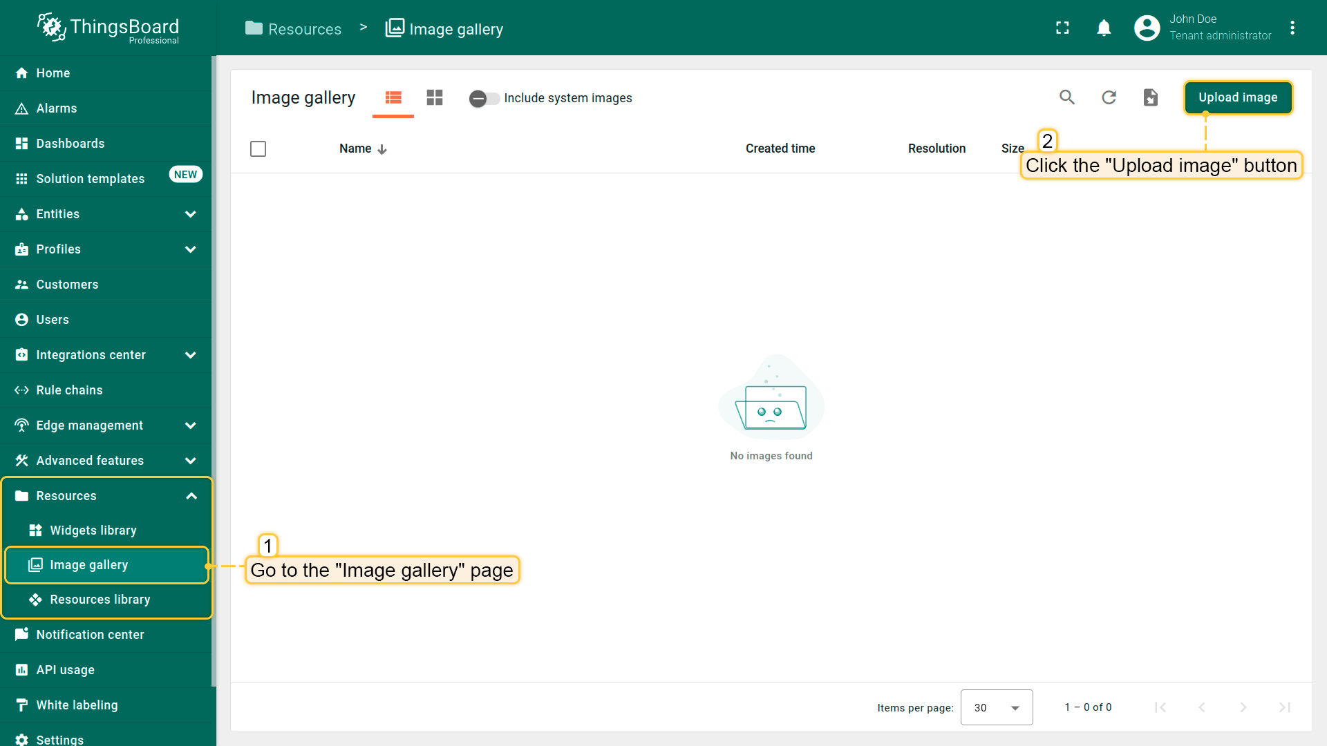 - Go to the "Image gallery" page in the "Resources" section. Then, click the “Upload image” button in the top right corner of the screen;