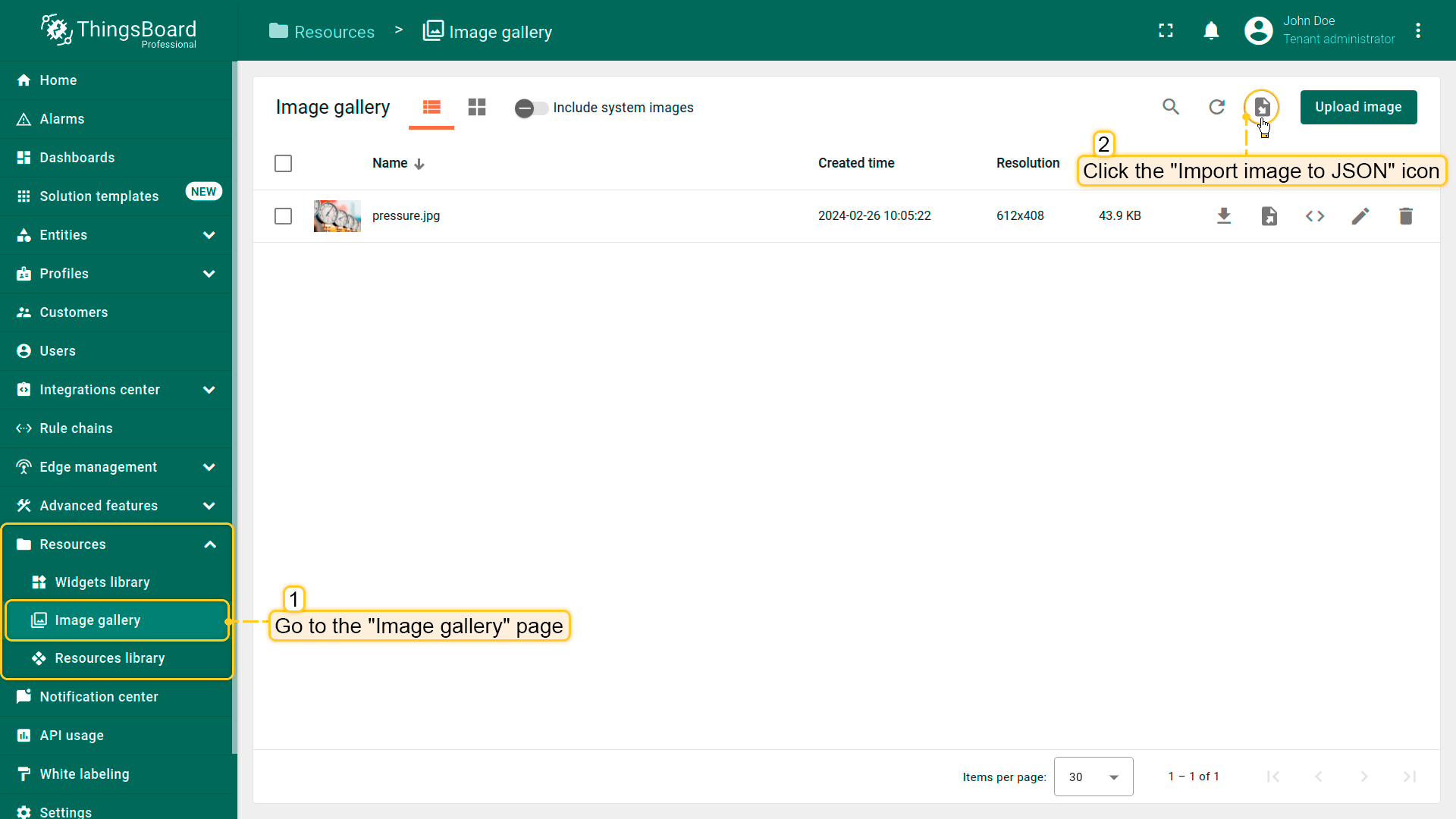 - Go to the "Image gallery" page in the "Resources" section. Then, click the "Import image" icon in the top right corner of the screen;