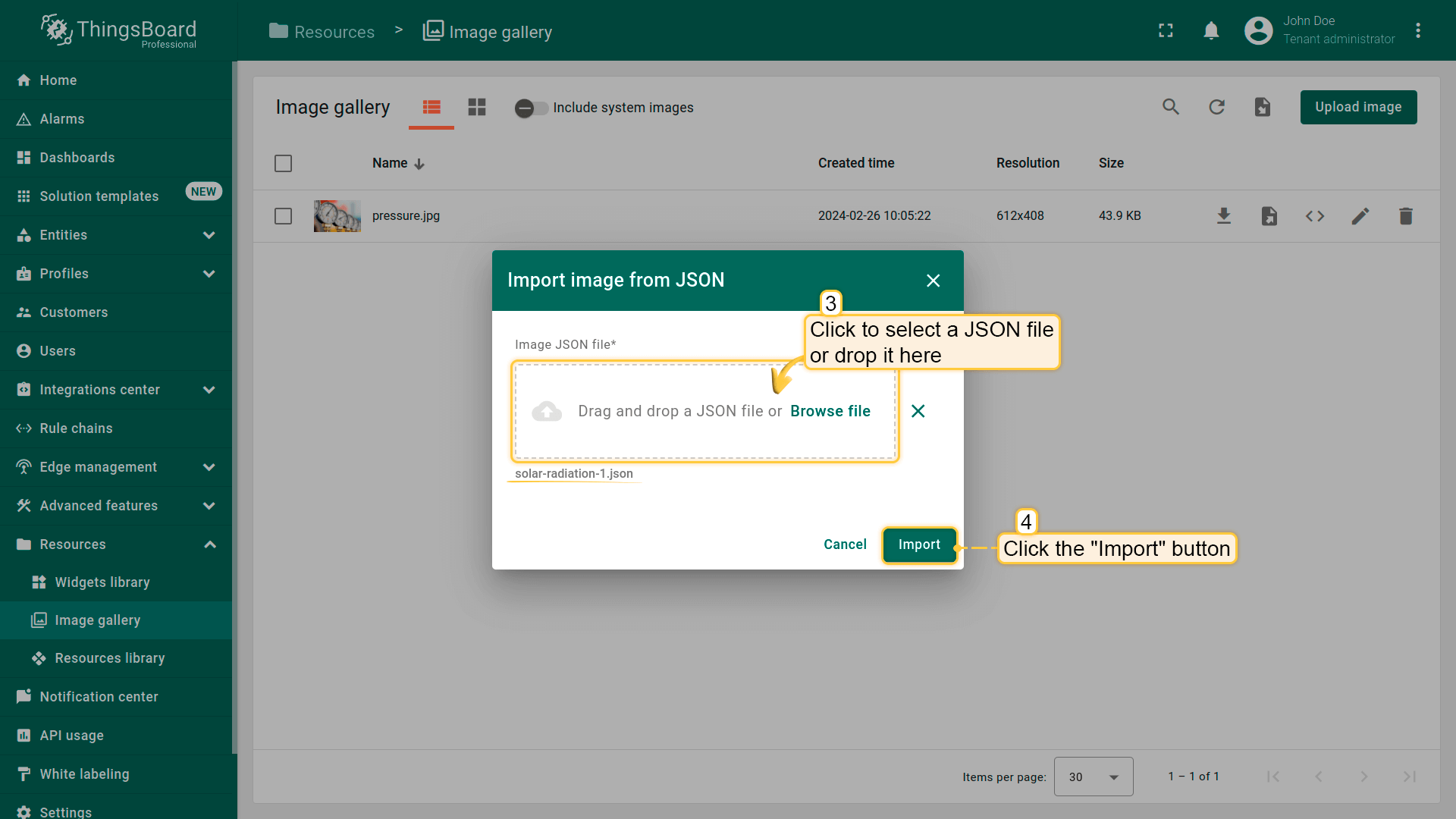 - In the "Import image" window, upload a JSON image file and click "Import";