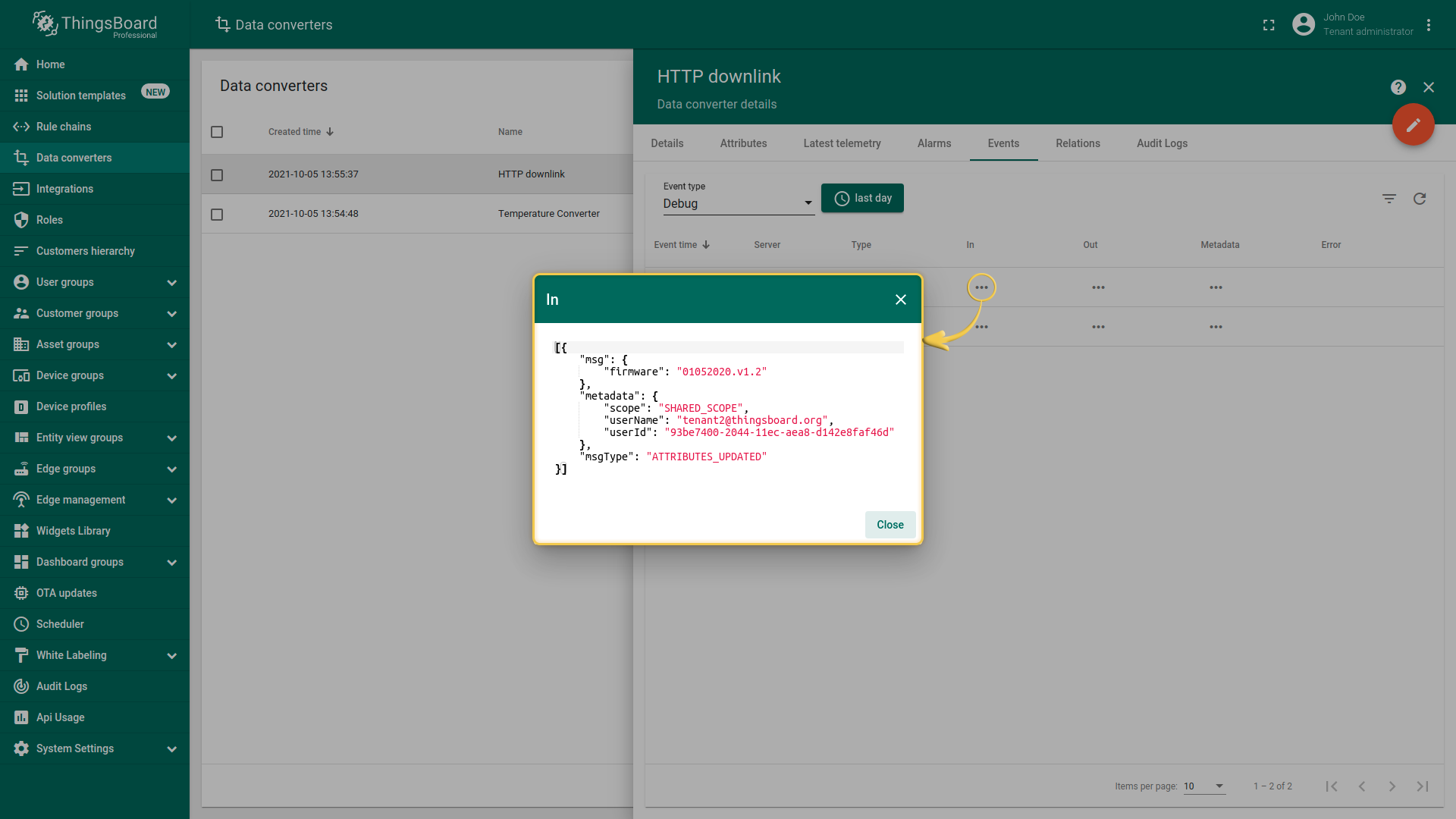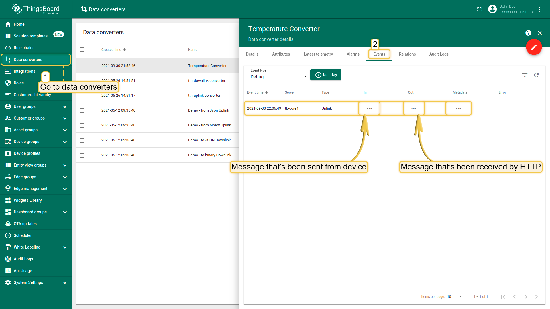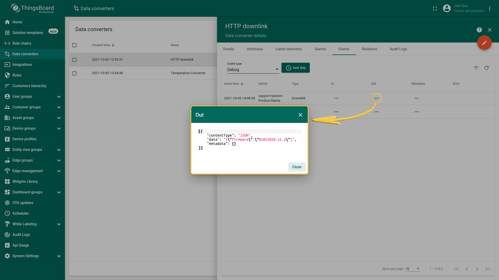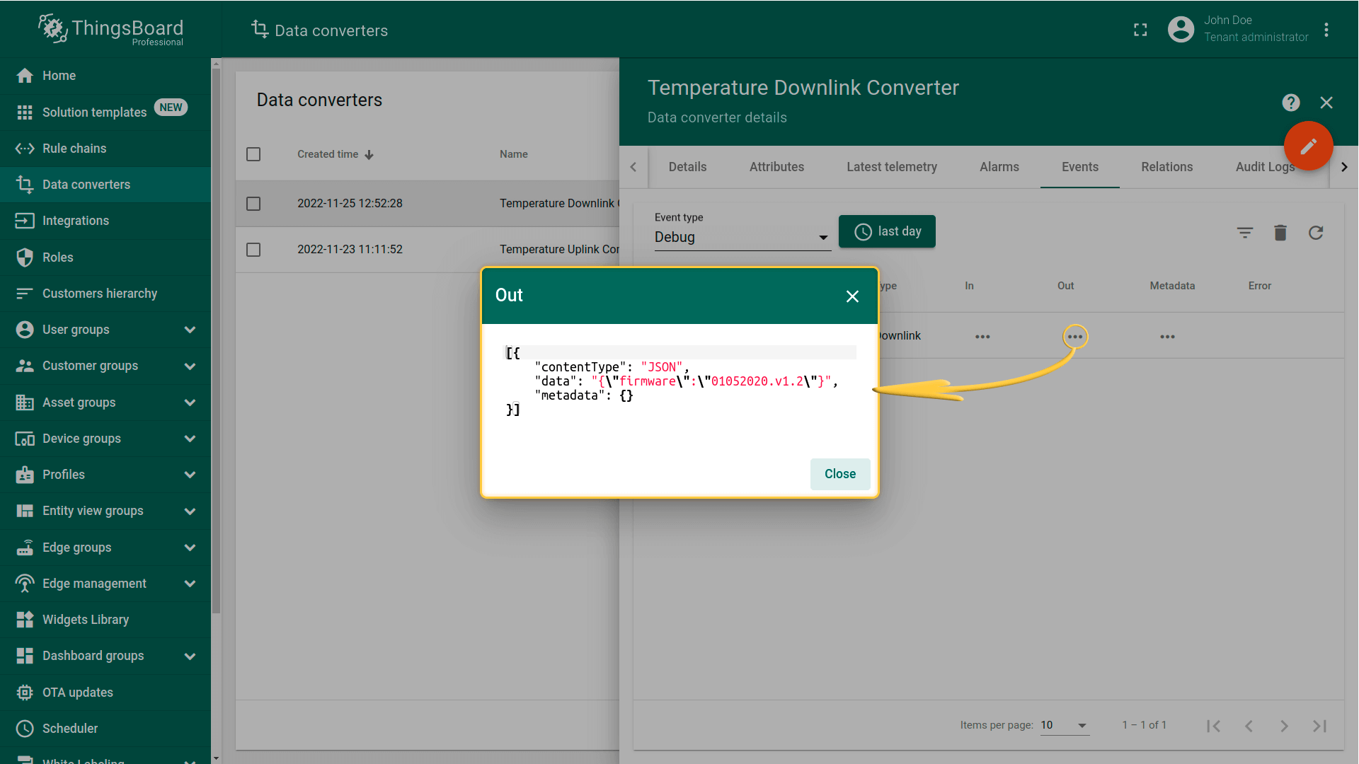 Create downlink converter in the “Data converters” page. To see events enable ‘Debug mode’.