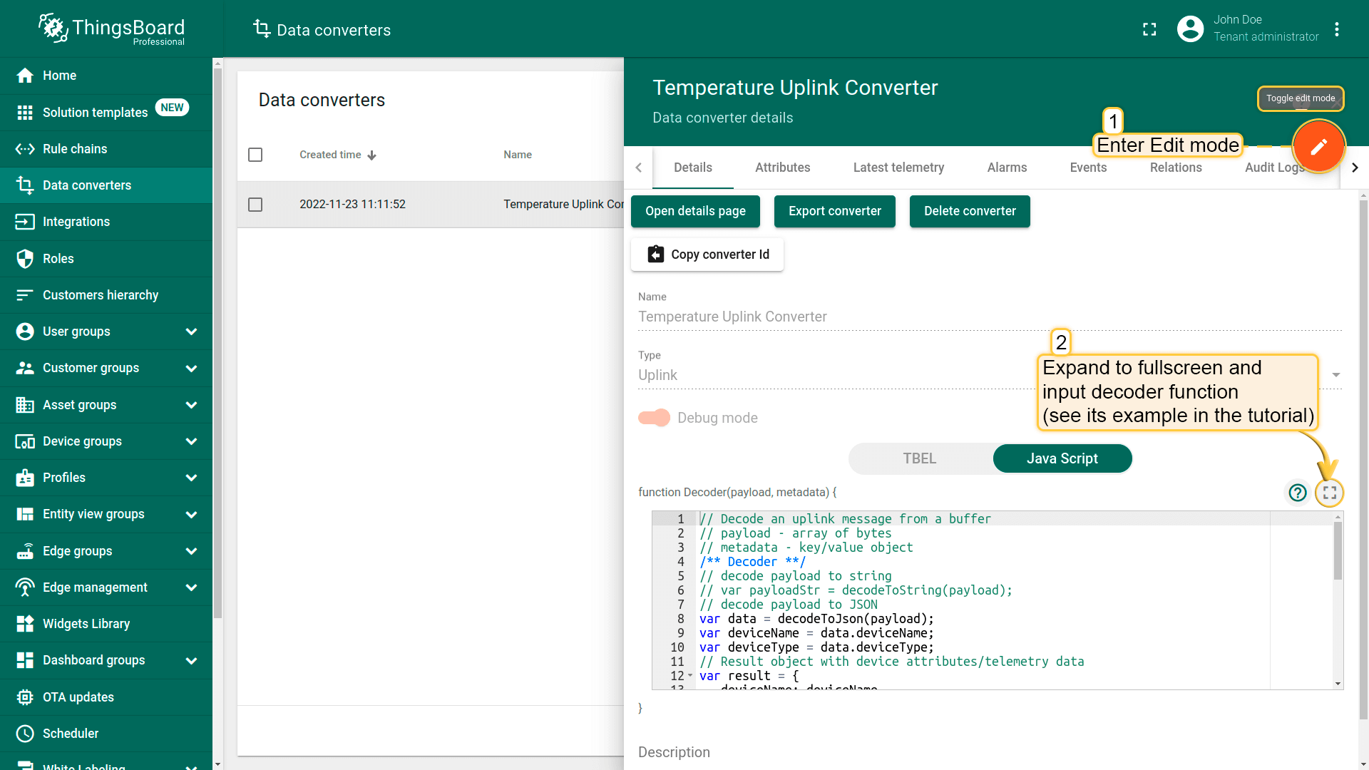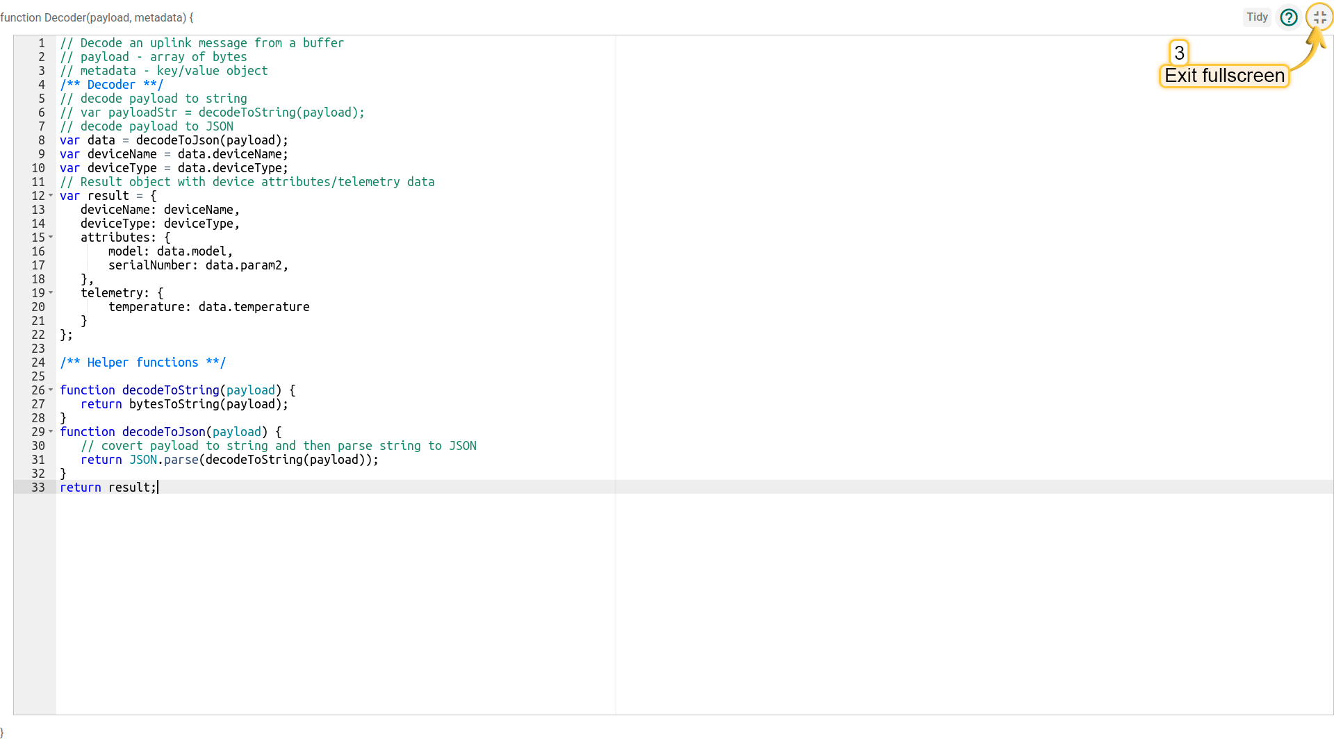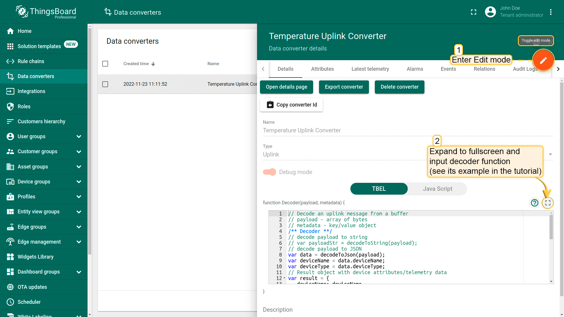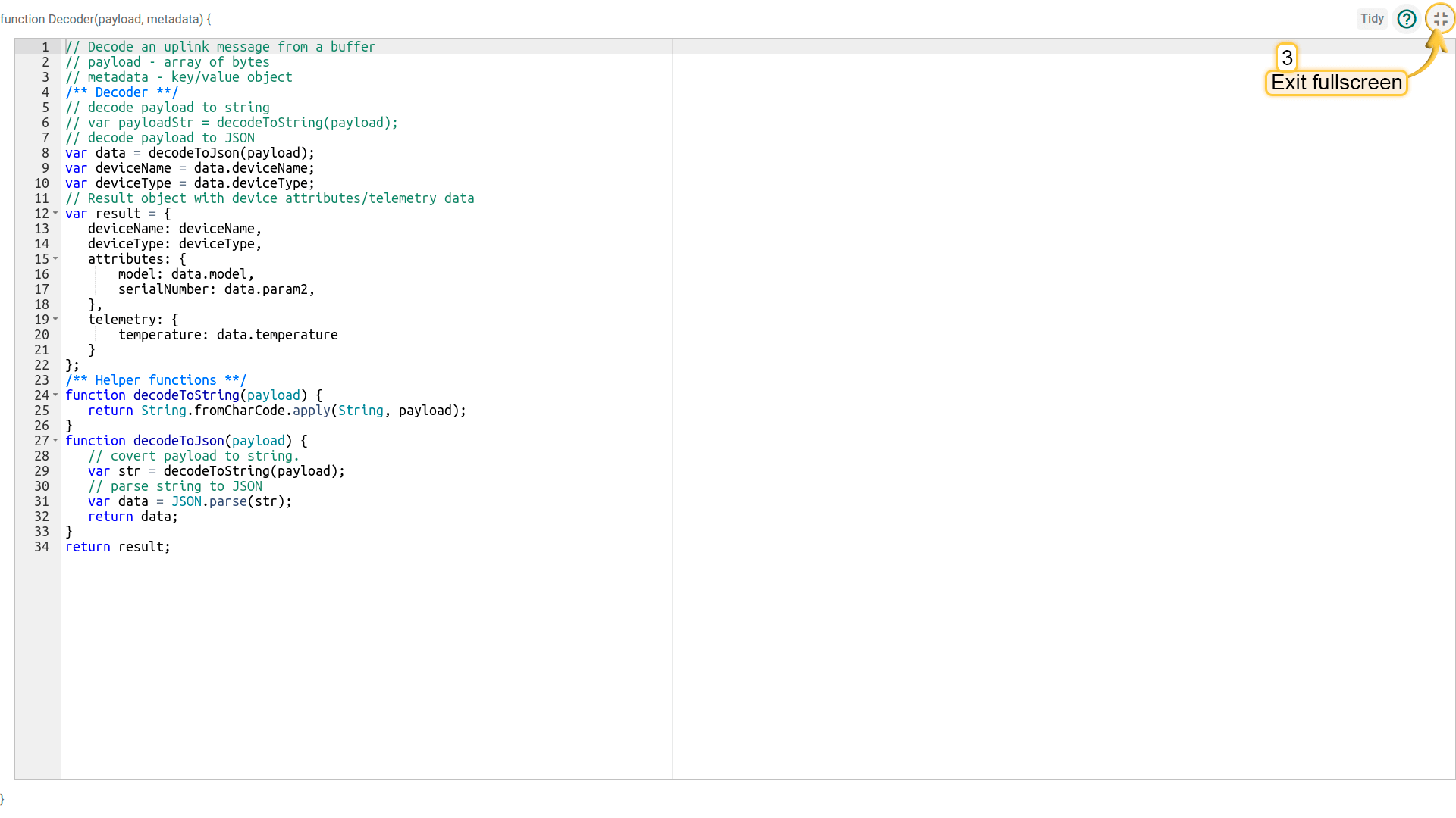 Example for the Uplink converter: You can change the decoder function while creating the converter or after creating it. If the converter has already been created, then click on the “pencil” icon to edit it. Copy the configuration example for the converter (or your own configuration) and insert it into the decoder function. Save changes by clicking on the “checkmark” icon. |
