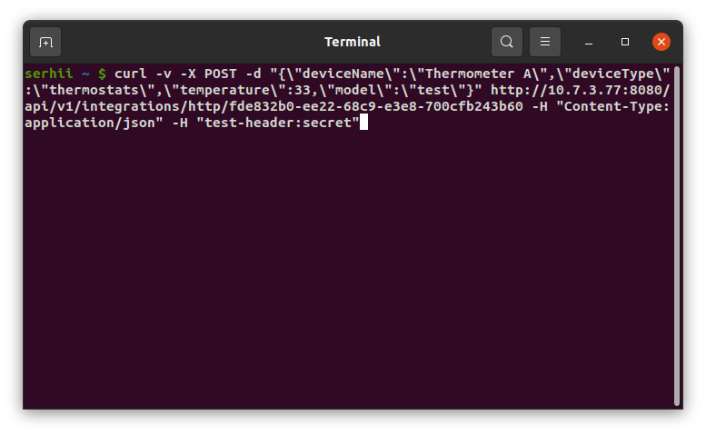 curl -v -X POST -d "{\"deviceName\":\"$DEVICE_NAME\",\"deviceType\":\"$DEVICE_TYPE\",\"temperature\":33,\"model\":\"test\"}" $YOUR_HTTP_ENDPOINT_URL -H "Content-Type:application/json" -H "$VALUE"
