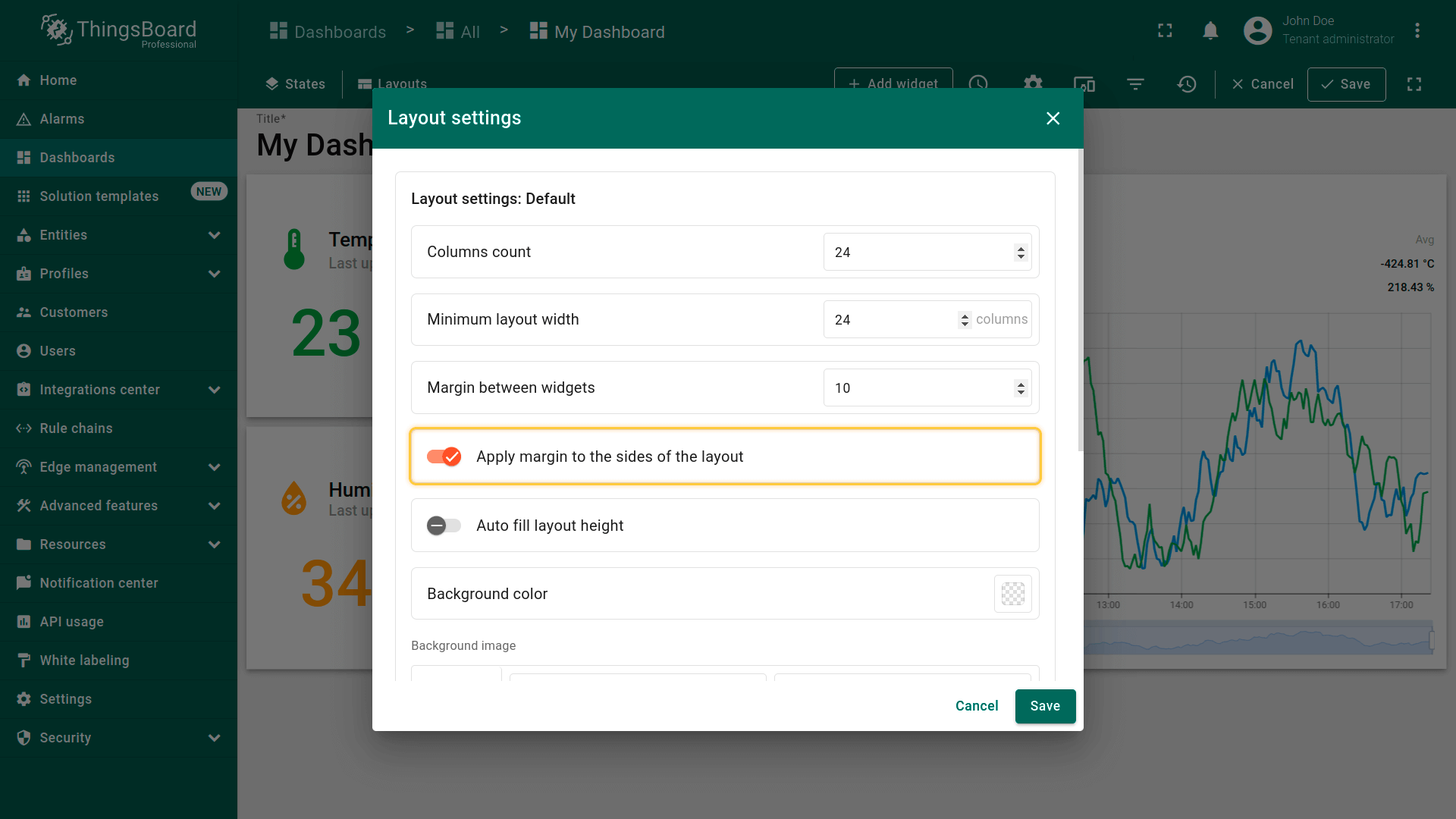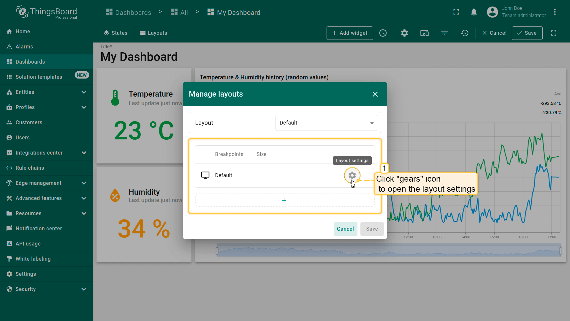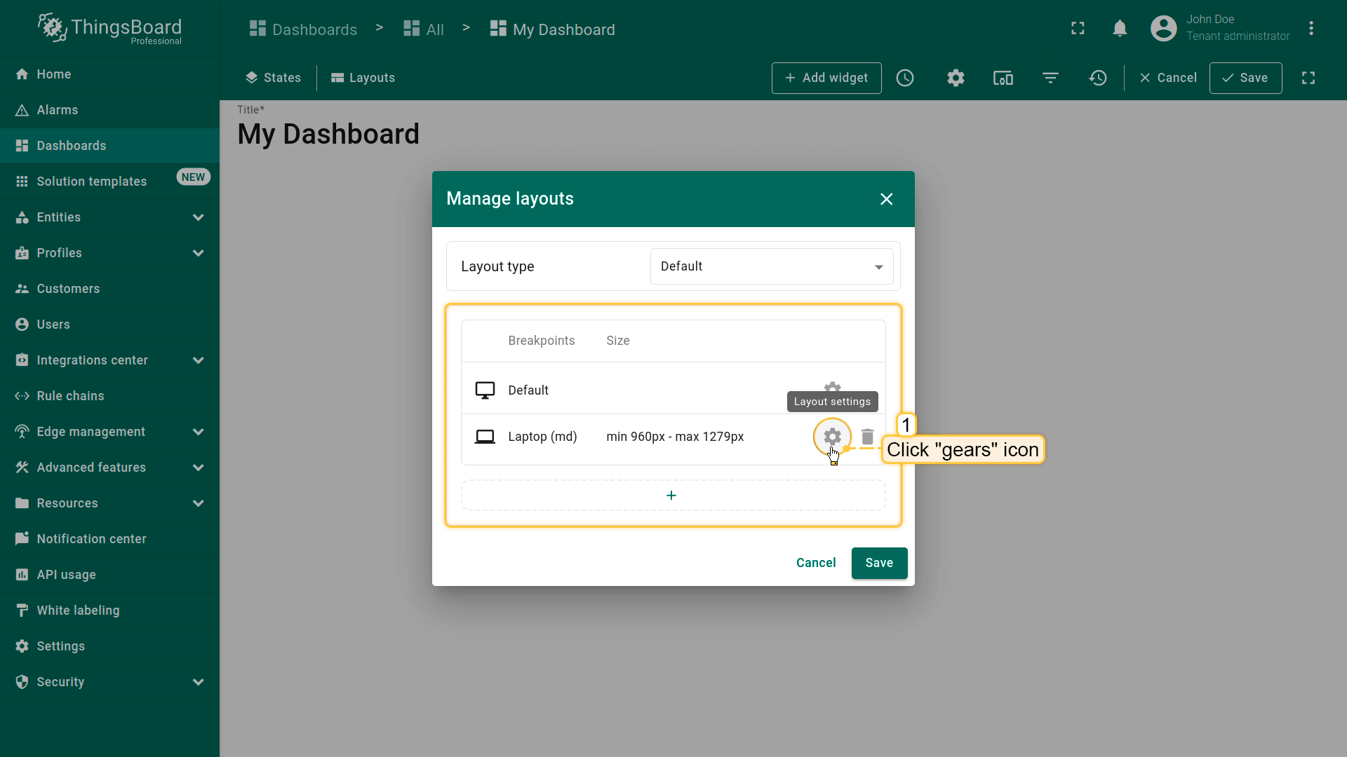 You can click the “gears” icon to open the layout settings for that breakpoint. Layout settings determine the background configurations of the dashboard and how widgets will be arranged on it.