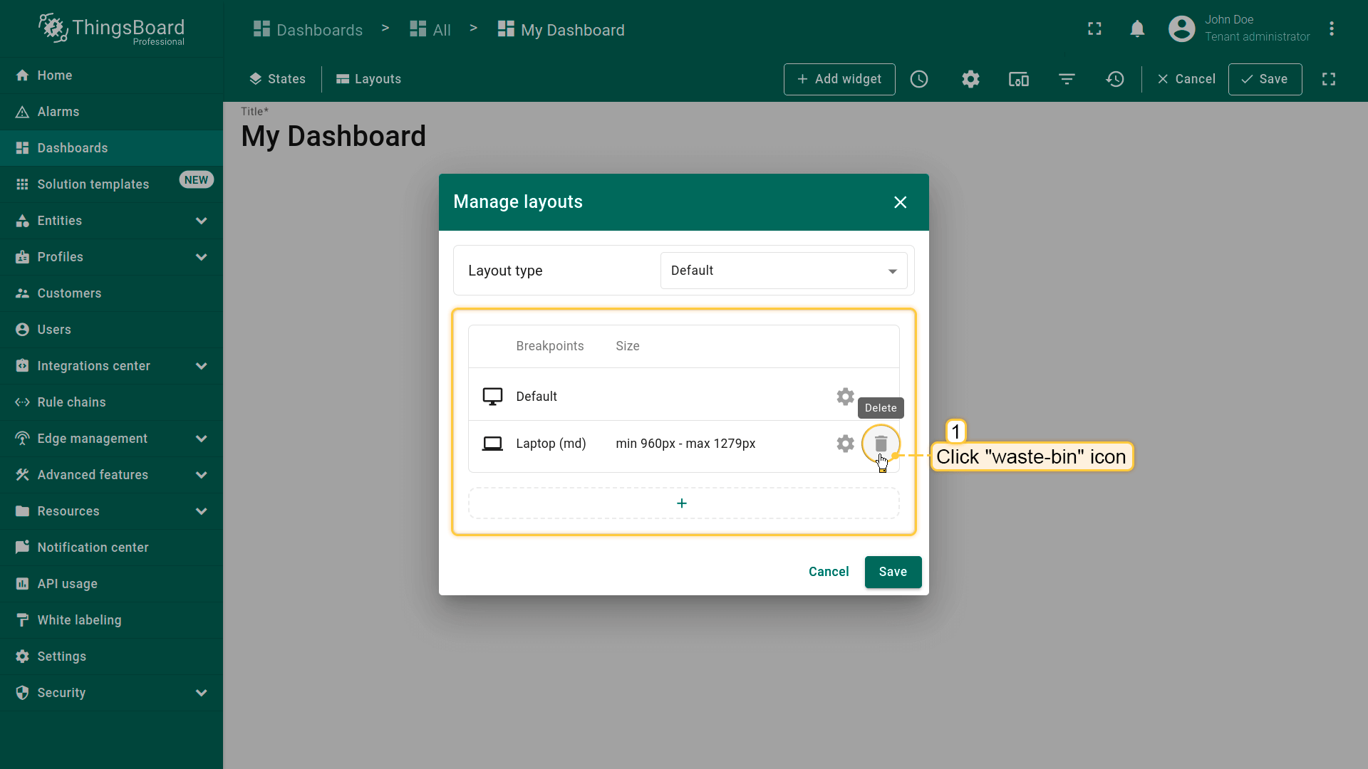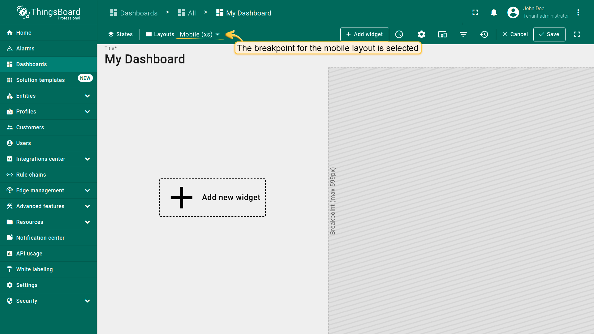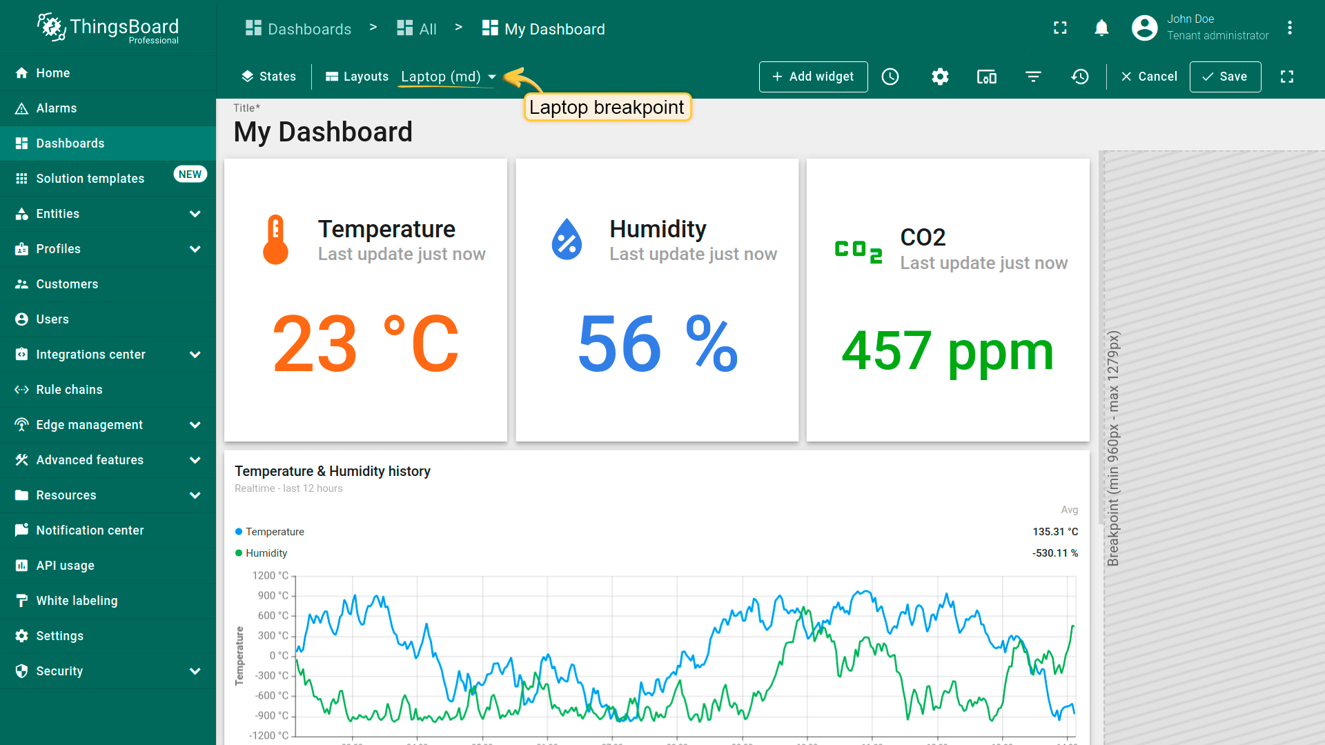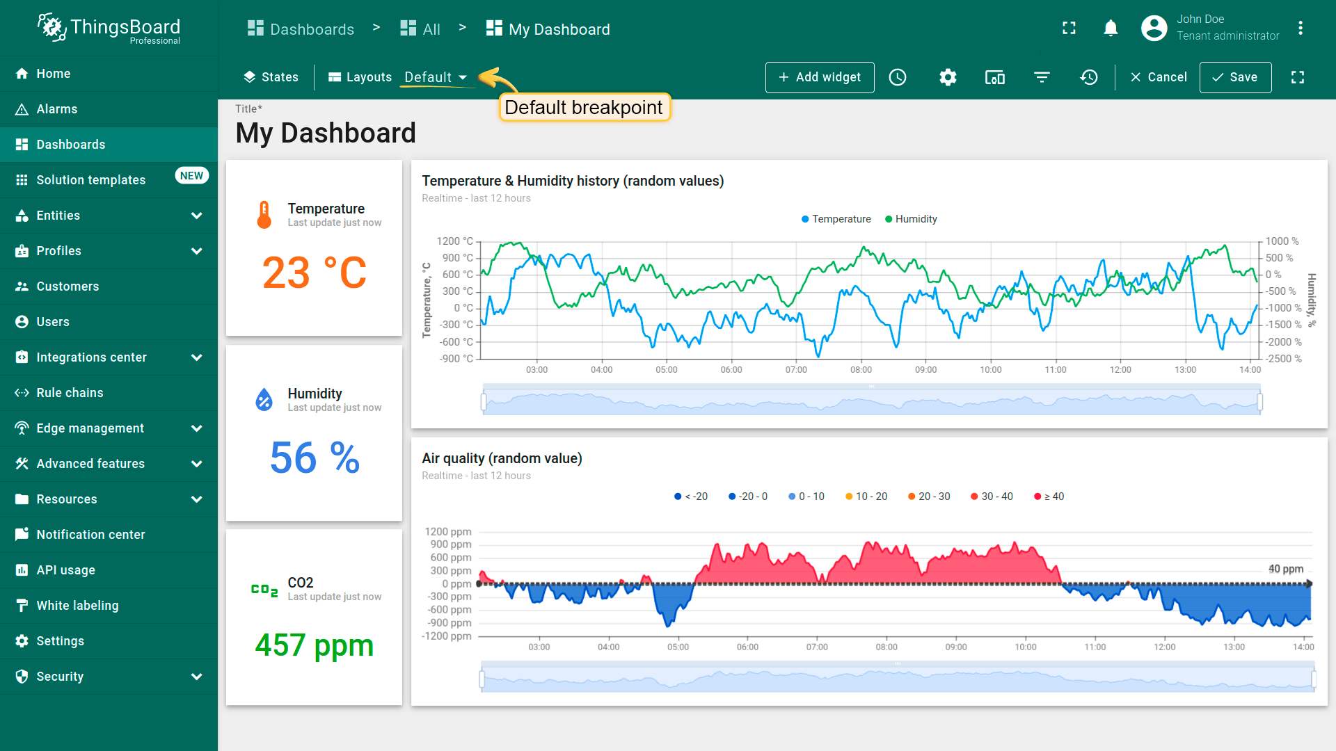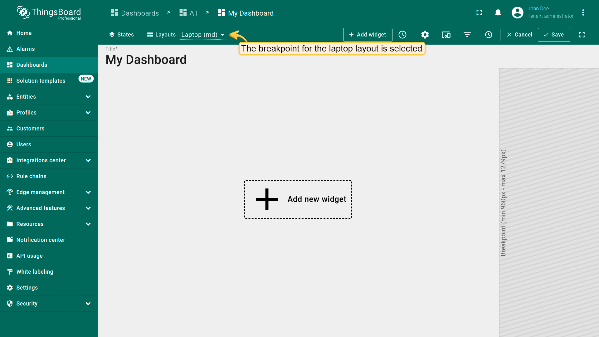Dashboard layouts organize how widgets appear on the dashboard grid. Each dashboard state can have its own layout type, settings, and breakpoints, which helps create tailored visual presentations for different IoT use cases and screen resolutions.