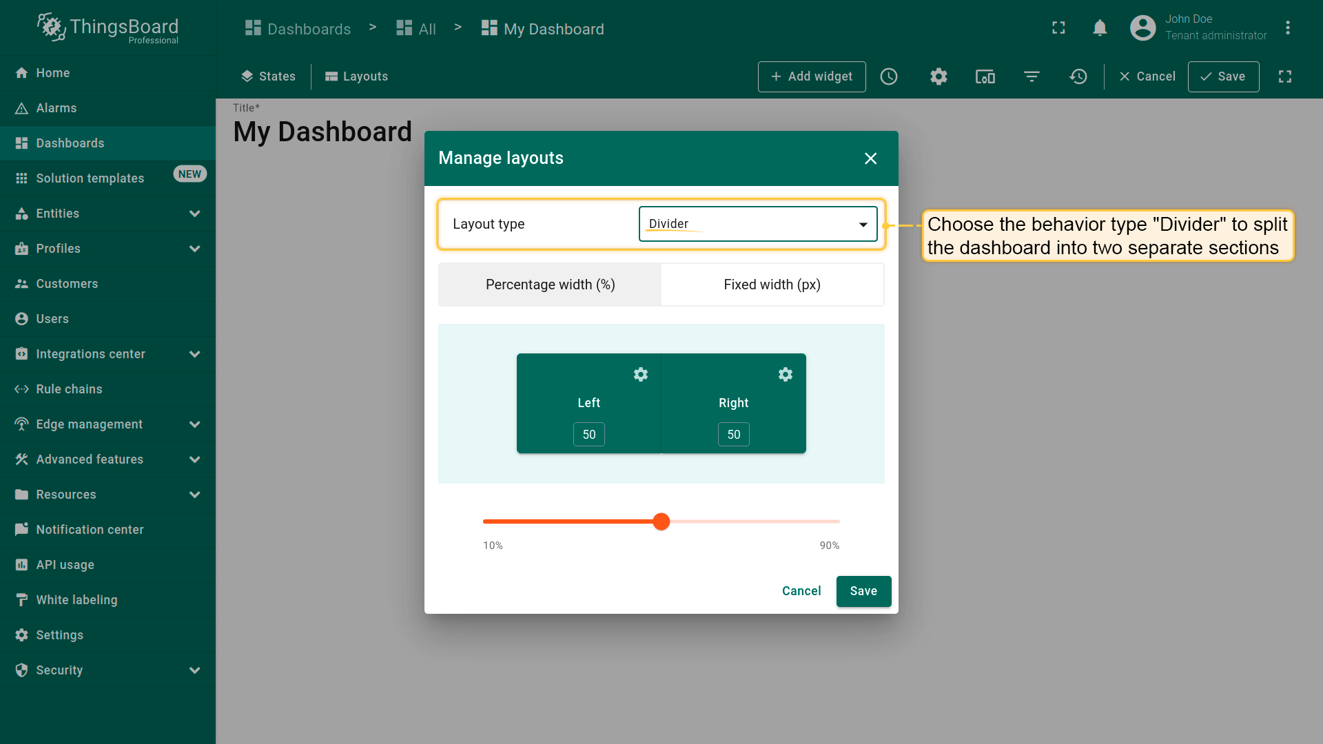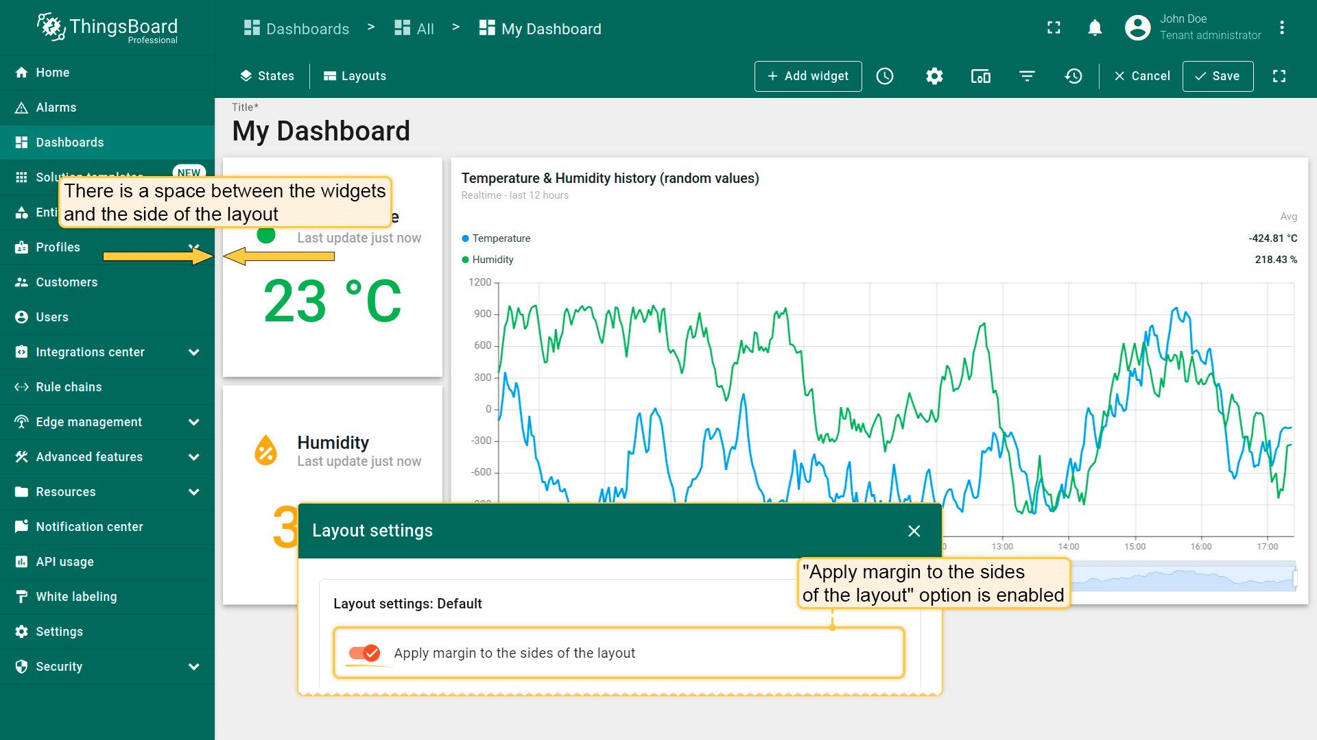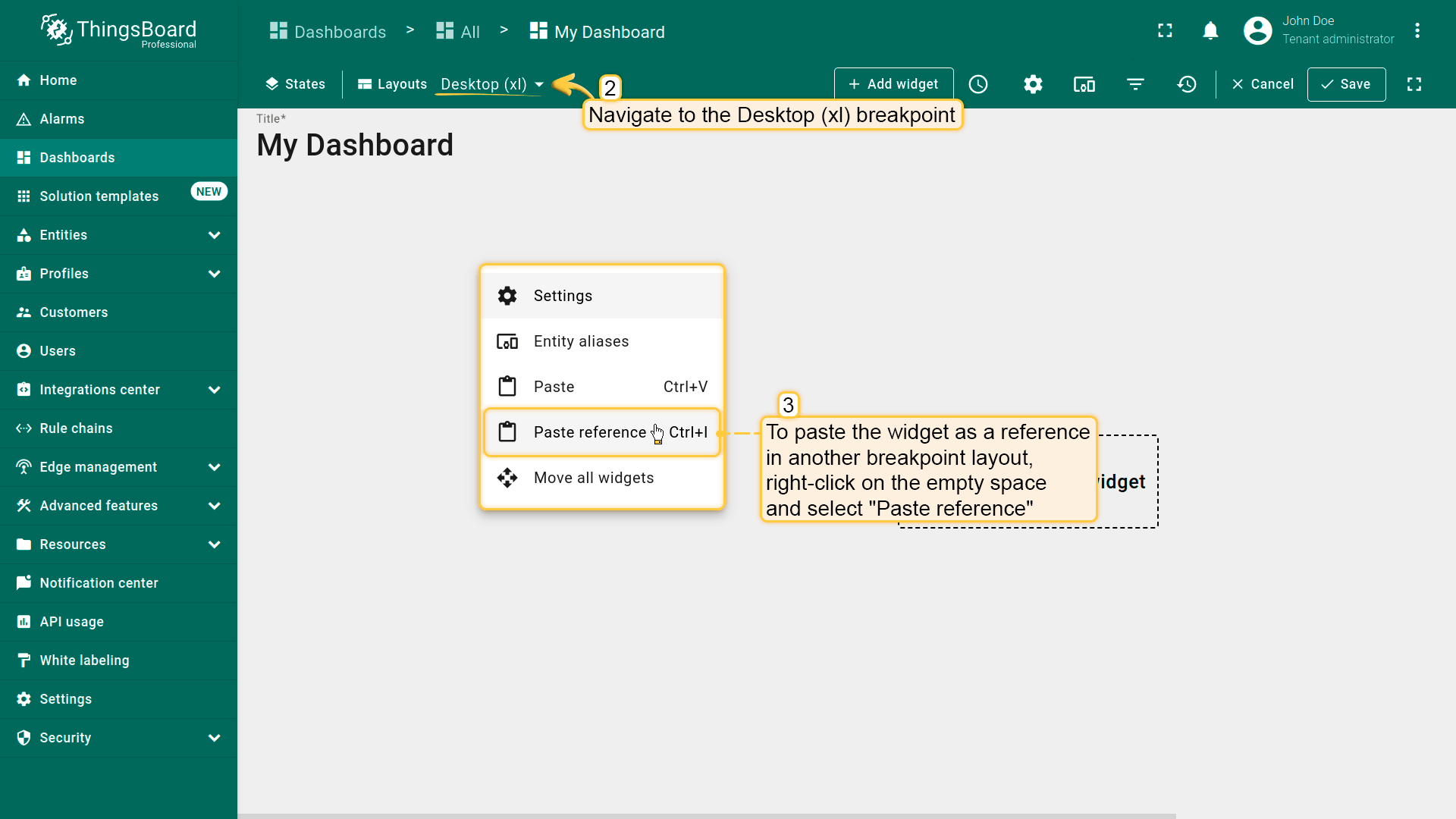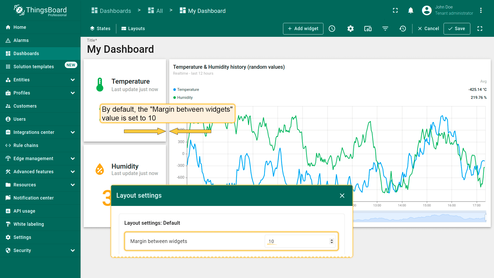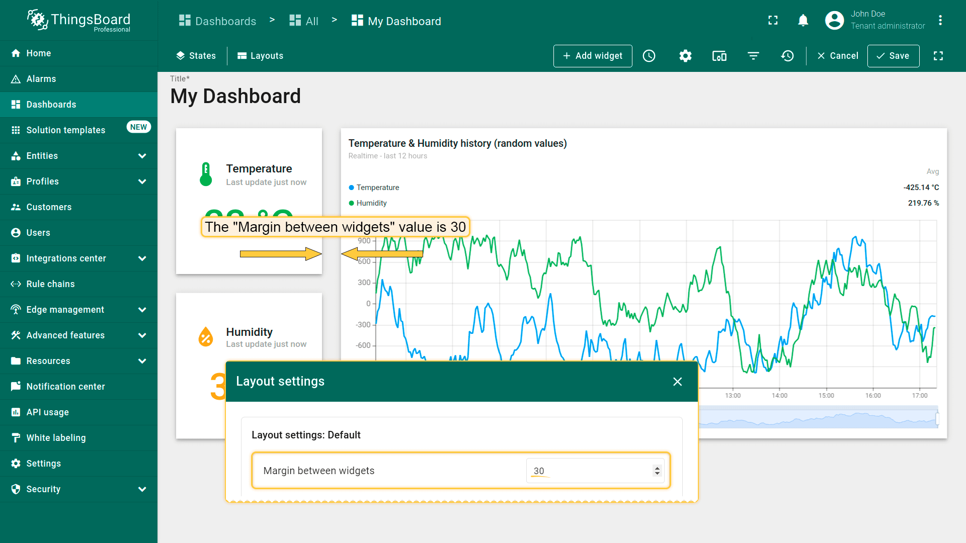 Dashboard layouts organize how widgets appear on the dashboard grid. Each dashboard state can have its own layout type, settings, and breakpoints, which helps create tailored visual presentations for different IoT use cases and screen resolutions.