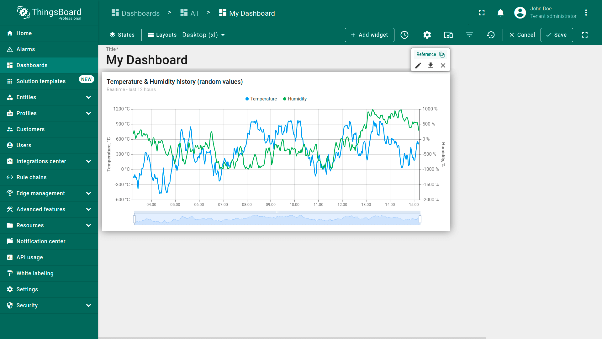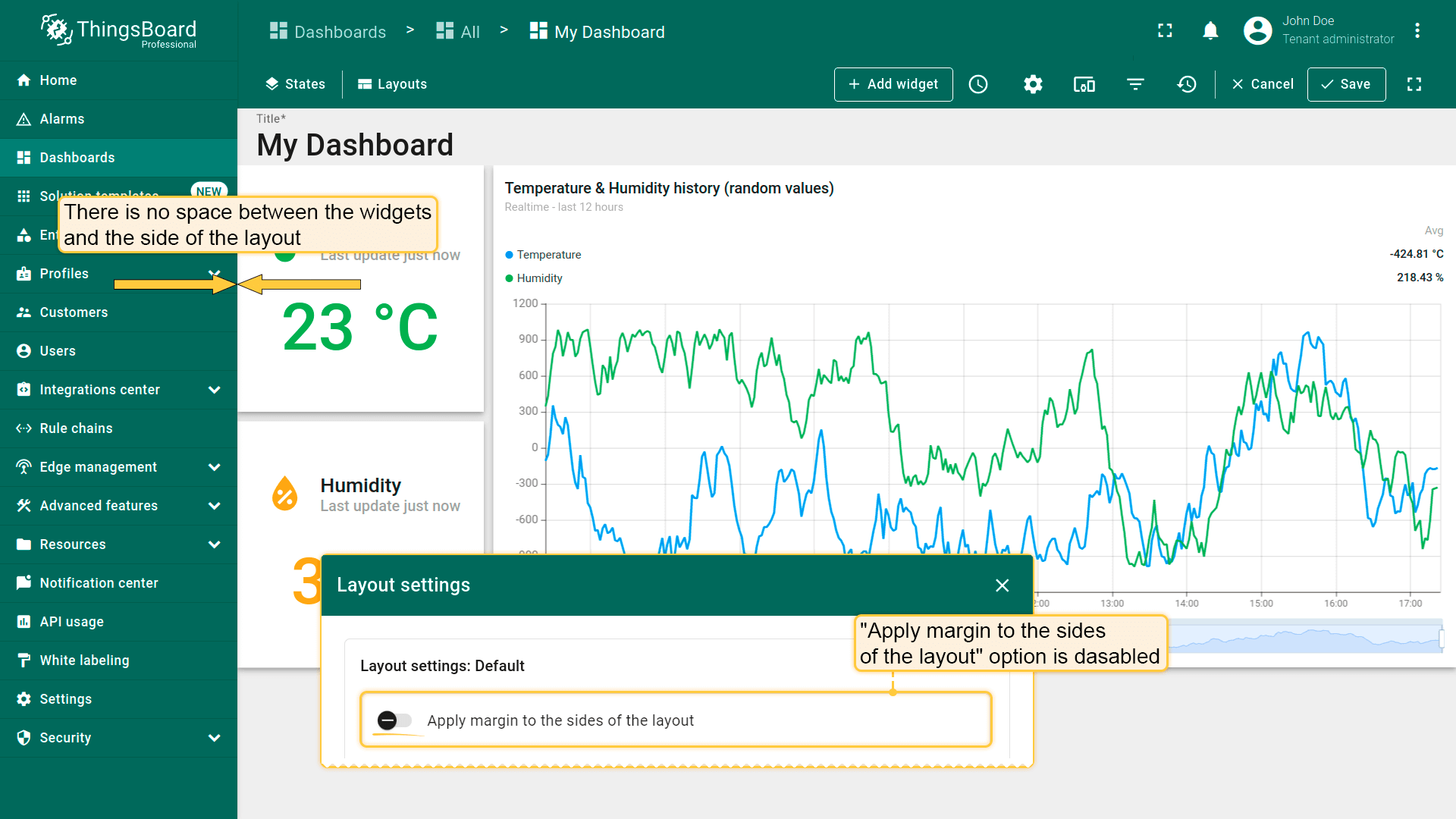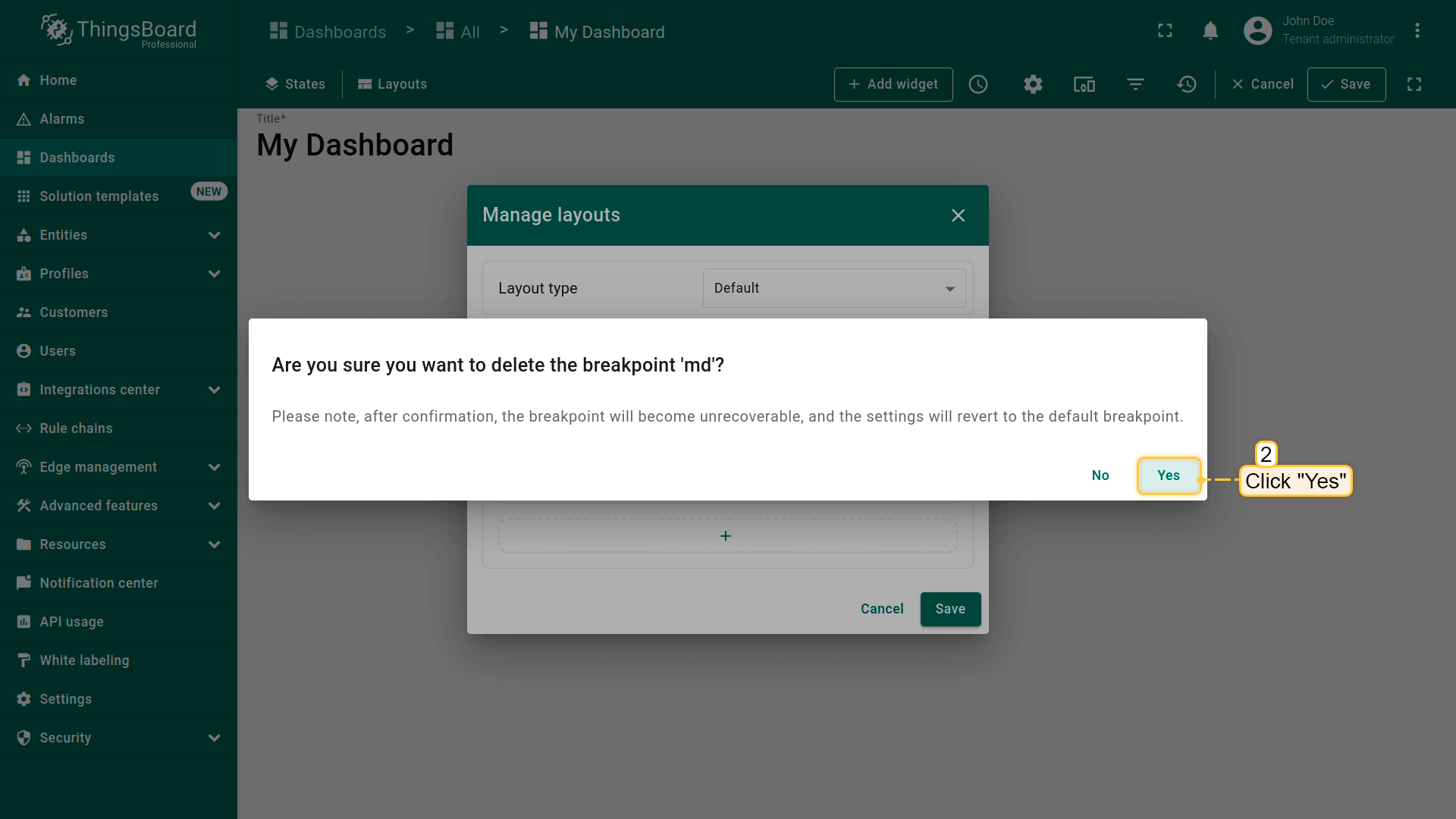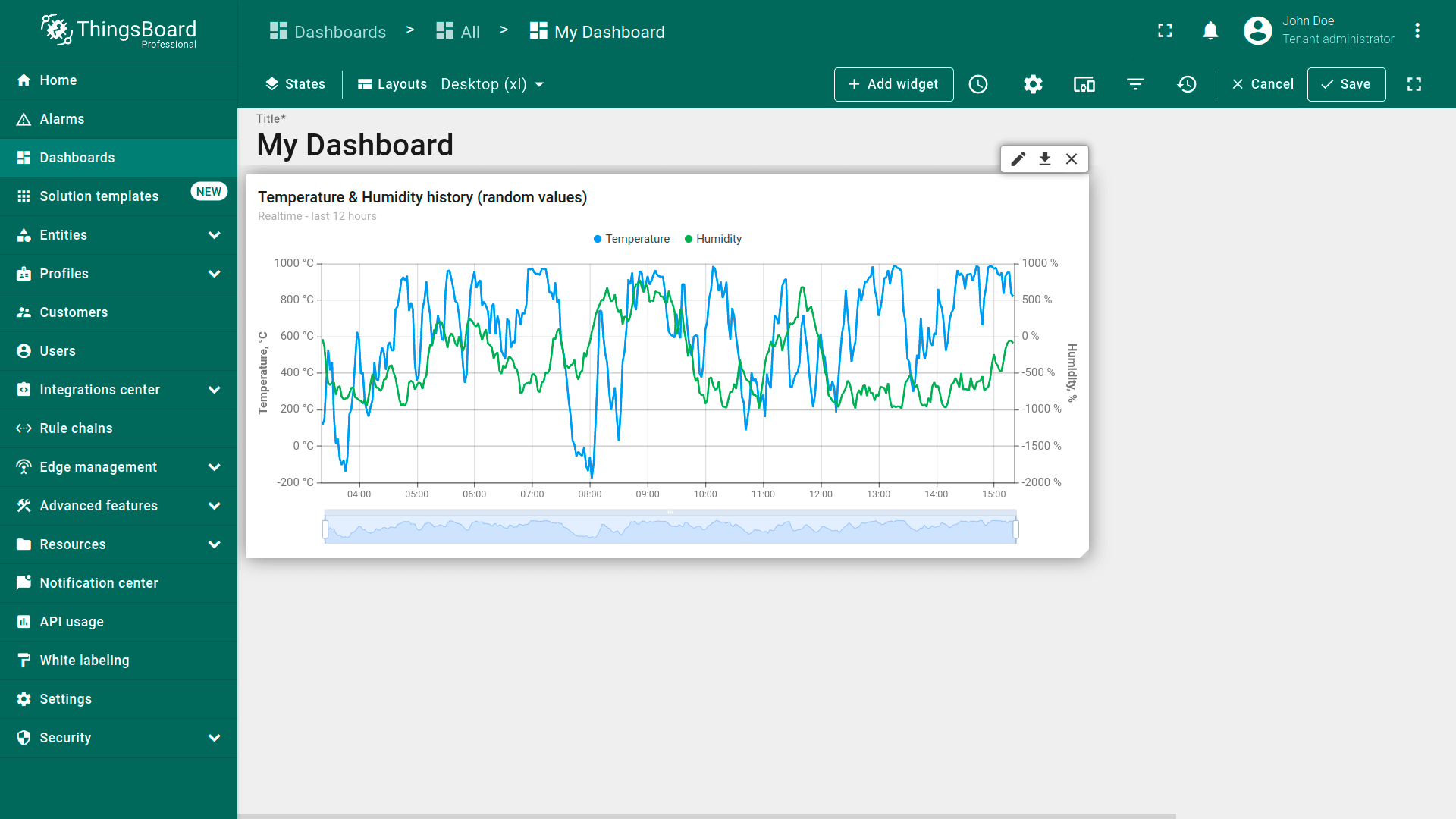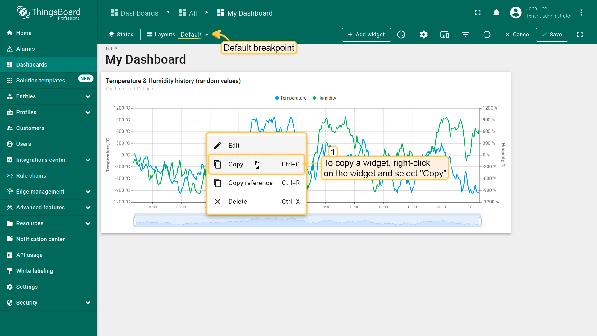 Dashboard layouts organize how widgets appear on the dashboard grid. Each dashboard state can have its own layout type, settings, and breakpoints, which helps create tailored visual presentations for different IoT use cases and screen resolutions.