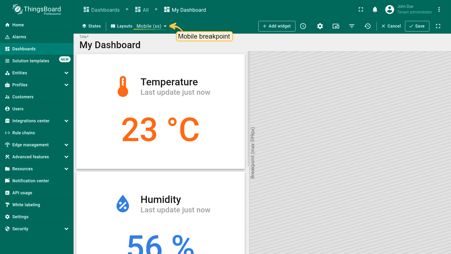 Breakpoints were introduced in IoT Hub 3.8.0. They allow you to define different layout settings and widgets based on the screen width of the end-user.