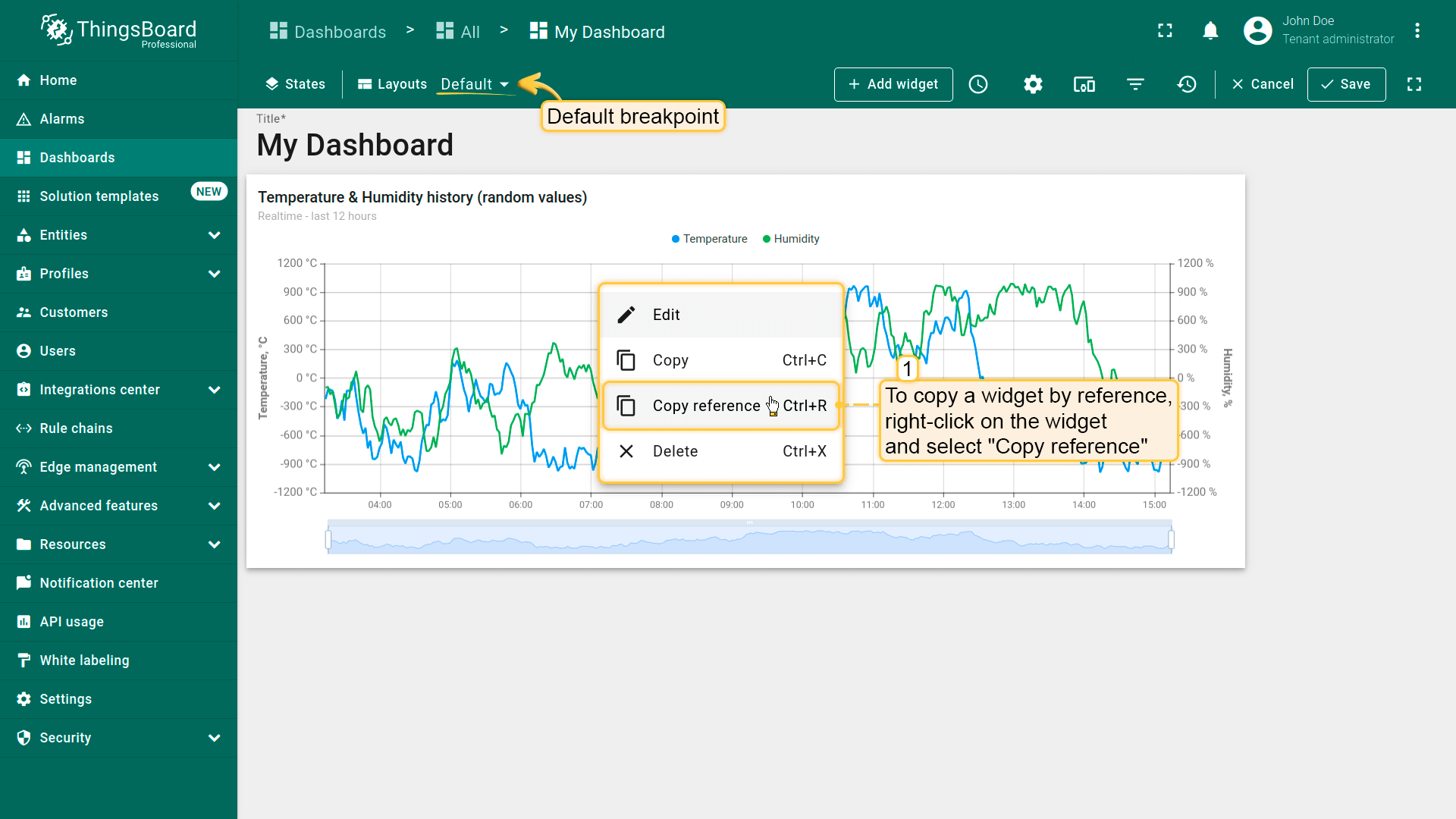 By default, when a new breakpoint layout is created, all widgets from the source layout are copied by reference. For example, if two breakpoints—Default and Desktop (xl)—reference the same chart widget, any changes made to the widget configuration will be synchronized between both layouts. However, changes to the widget’s position and size are independent for each layout.