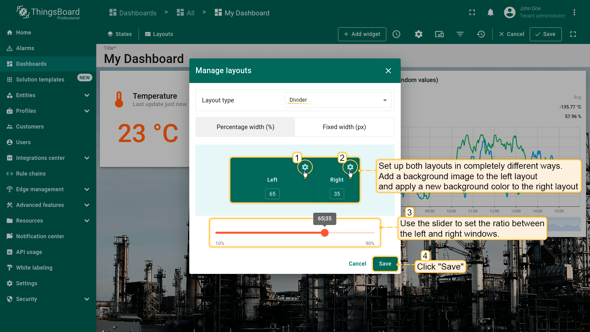 Just to see how it can look like, let’s set up both layouts in completely different ways. Add a background image to the left layout and apply a new background color to the right layout. And we resize the window in a certain percentage ratio to each other (it is just an example and definitely not a recommendation). After setting the parameters, click the “Save” button in the Layouts window to see the changes.