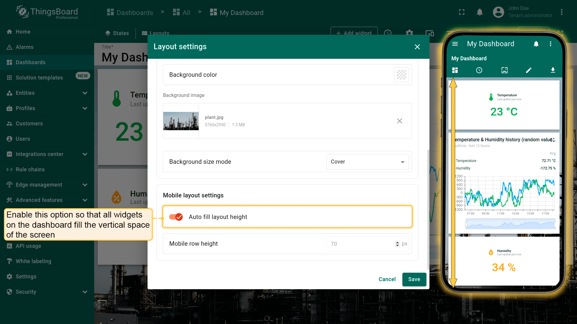By default, the “Auto fill layout height” checkbox is unchecked so that you can freely adjust the size of the widgets for your mobile device. If you tick this option, all the widgets on the Dashboard will fill in vertically in the space of the screen.