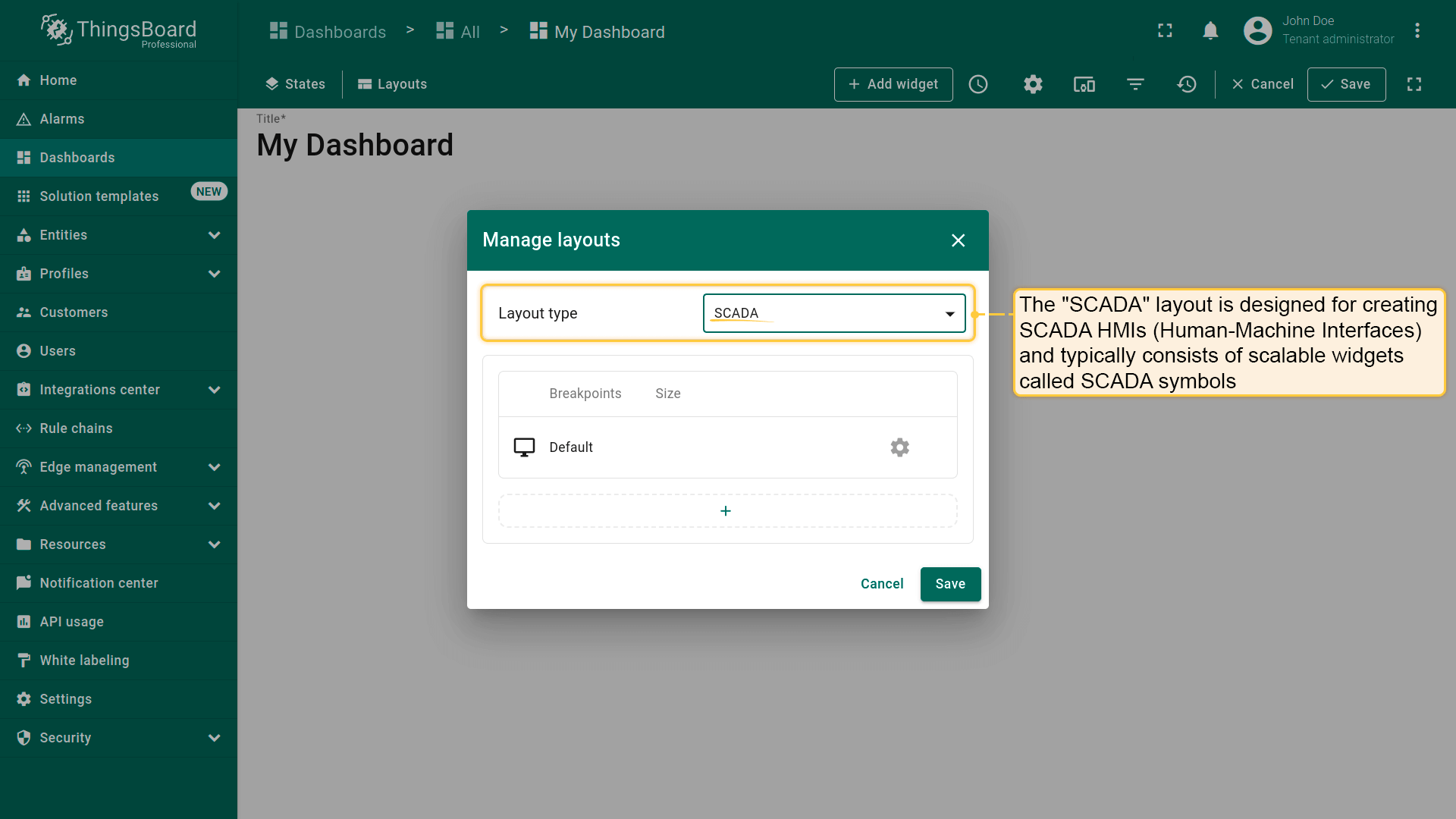The SCADA layout is designed for creating SCADA HMIs (Human-Machine Interfaces). SCADA HMIs typically consist of scalable widgets called SCADA symbols. However, you can also combine SCADA symbols with over 500 existing IoT Hub widgets on the same layout. This layout type also supports screen breakpoints for responsive design.