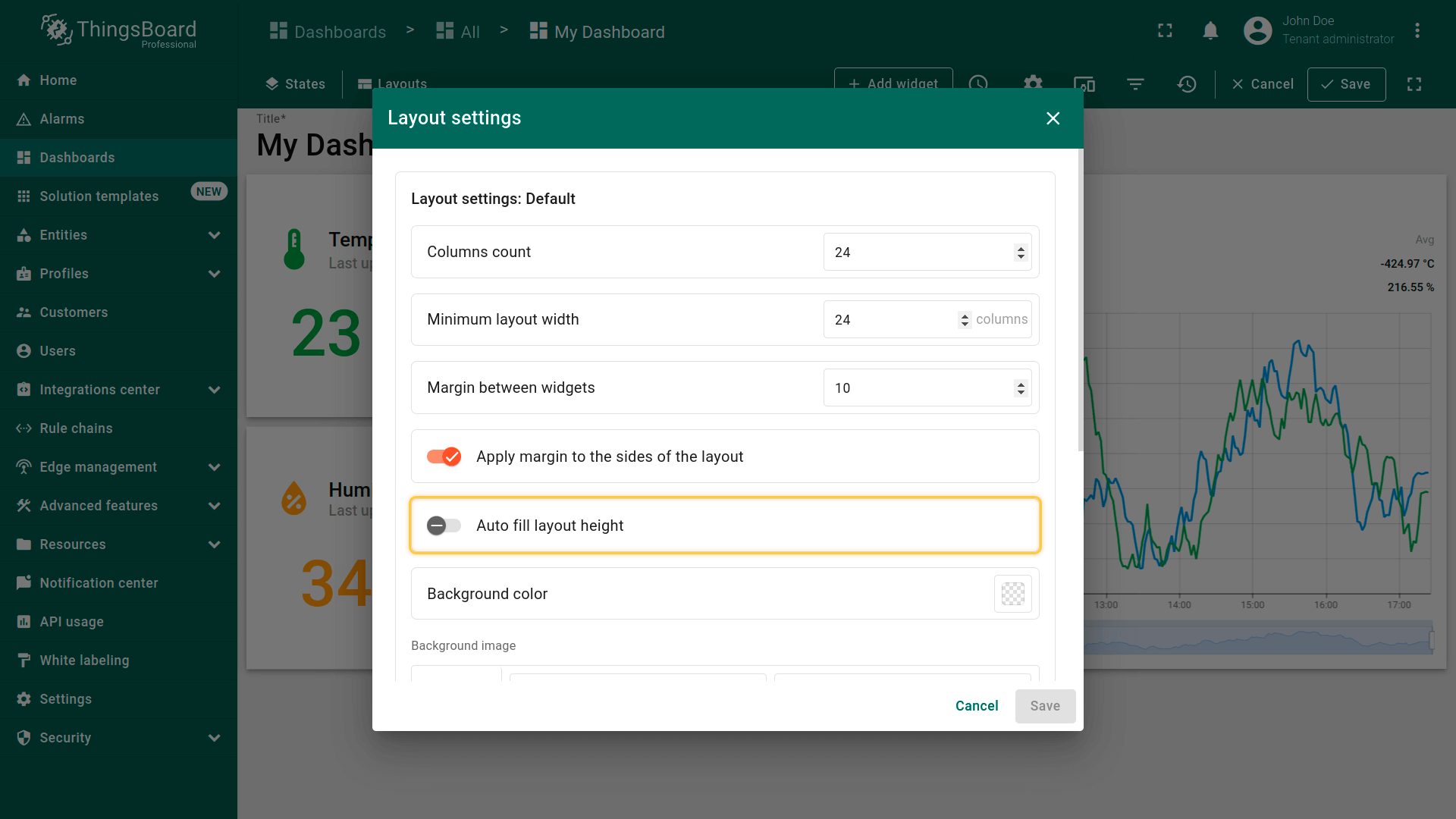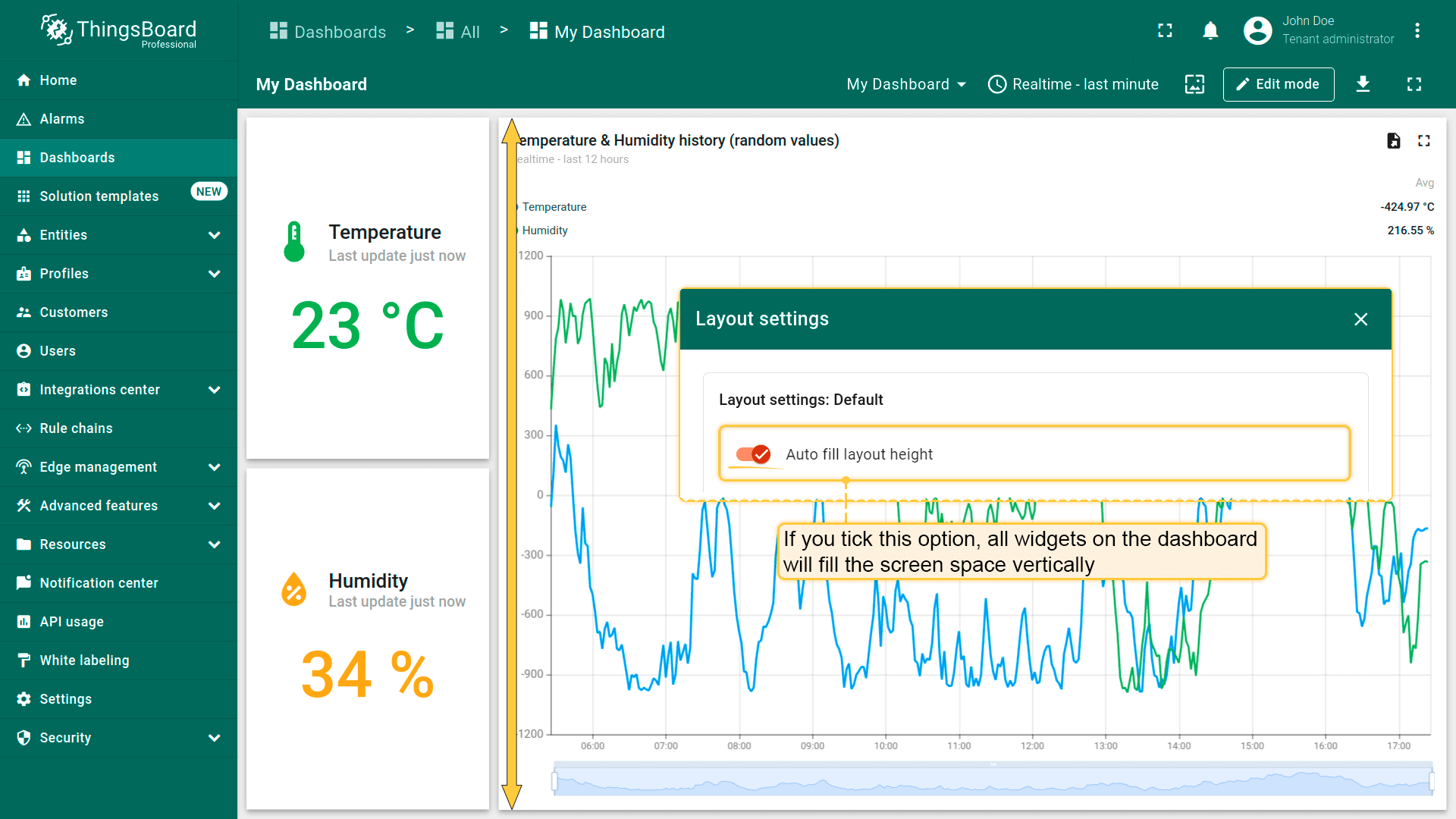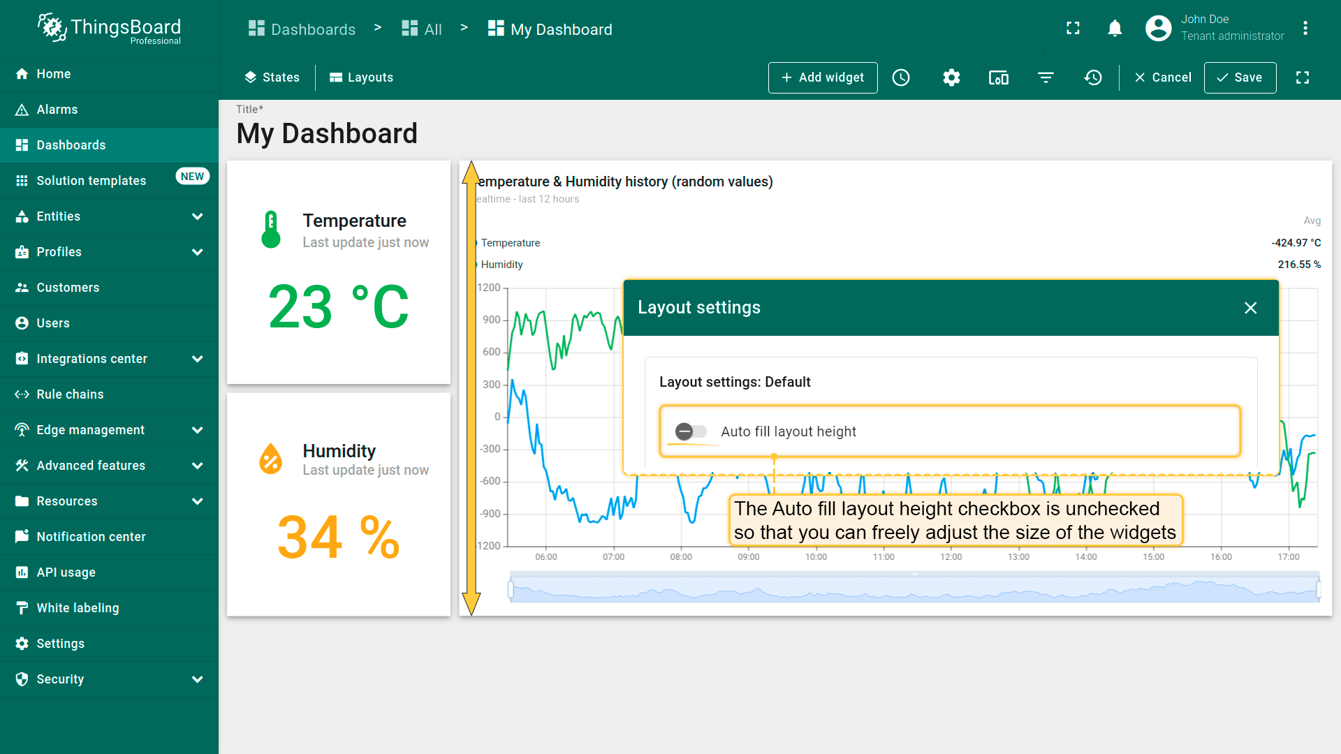 By default, the “Auto fill layout height” checkbox is unchecked so that you can freely adjust the size of the widgets. If you tick this option, all the widgets on the dashboard will fill in vertically in the space of the screen.
