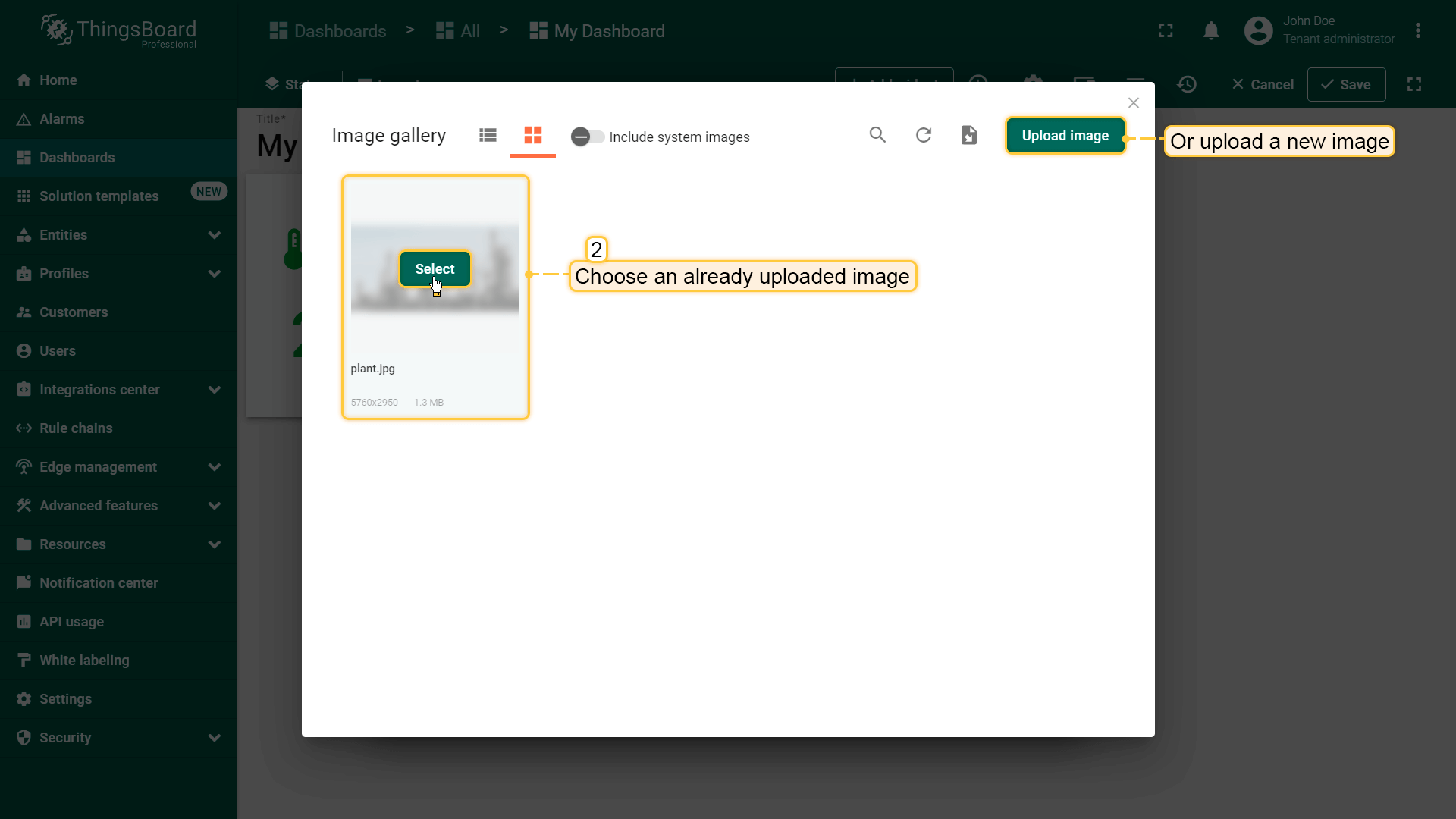 This option allows you to set an image as the background of the dashboard. You can choose an image from the Image gallery or set a direct link.