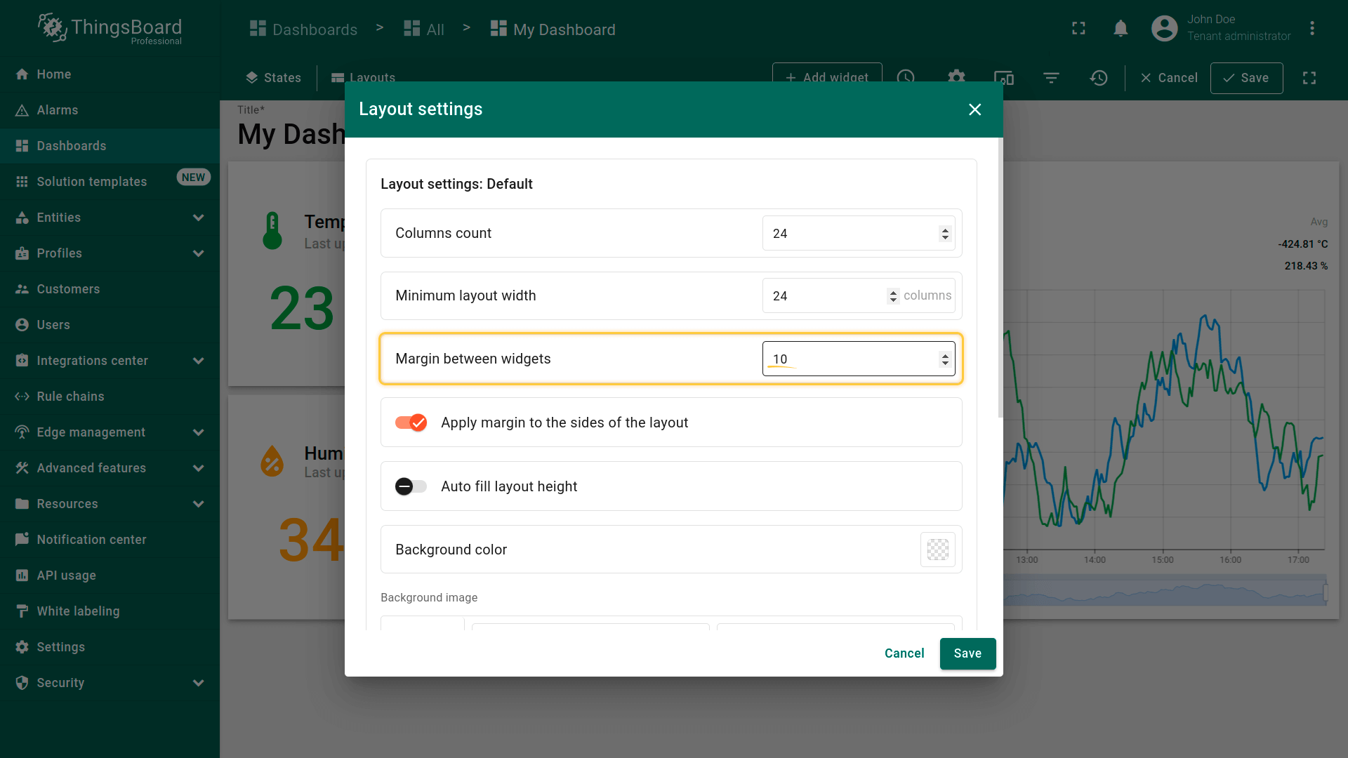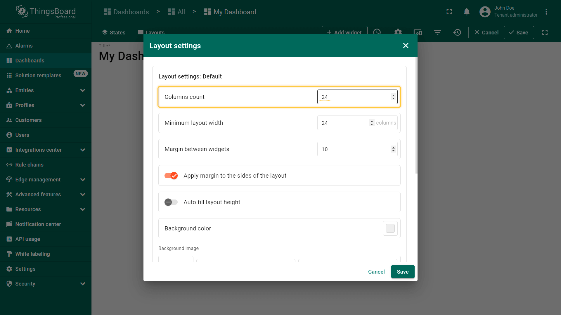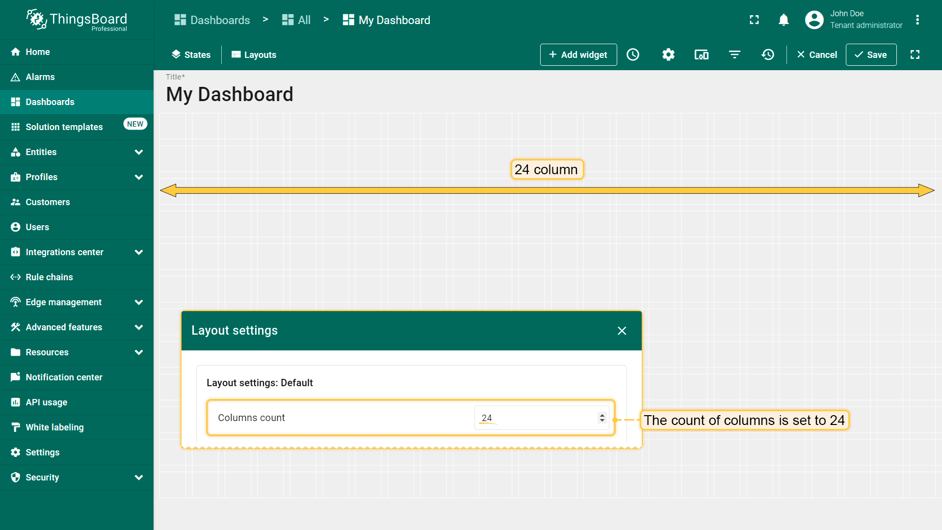 While editing the dashboard, specifically the size and space of your widgets, you can notice a whitish grid on a gray background. These are columns that determine how many widgets can fit horizontally on a Dashboard. By default, the number of columns is 24. You can increase or decrease their number. The minimum number of columns is 10. The maximum number is 1000 columns.