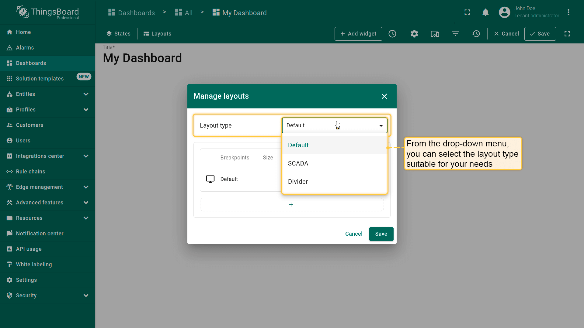 The platform supports three layout types: Default, SCADA, and Divider. Each dashboard state has exactly one layout type configured.