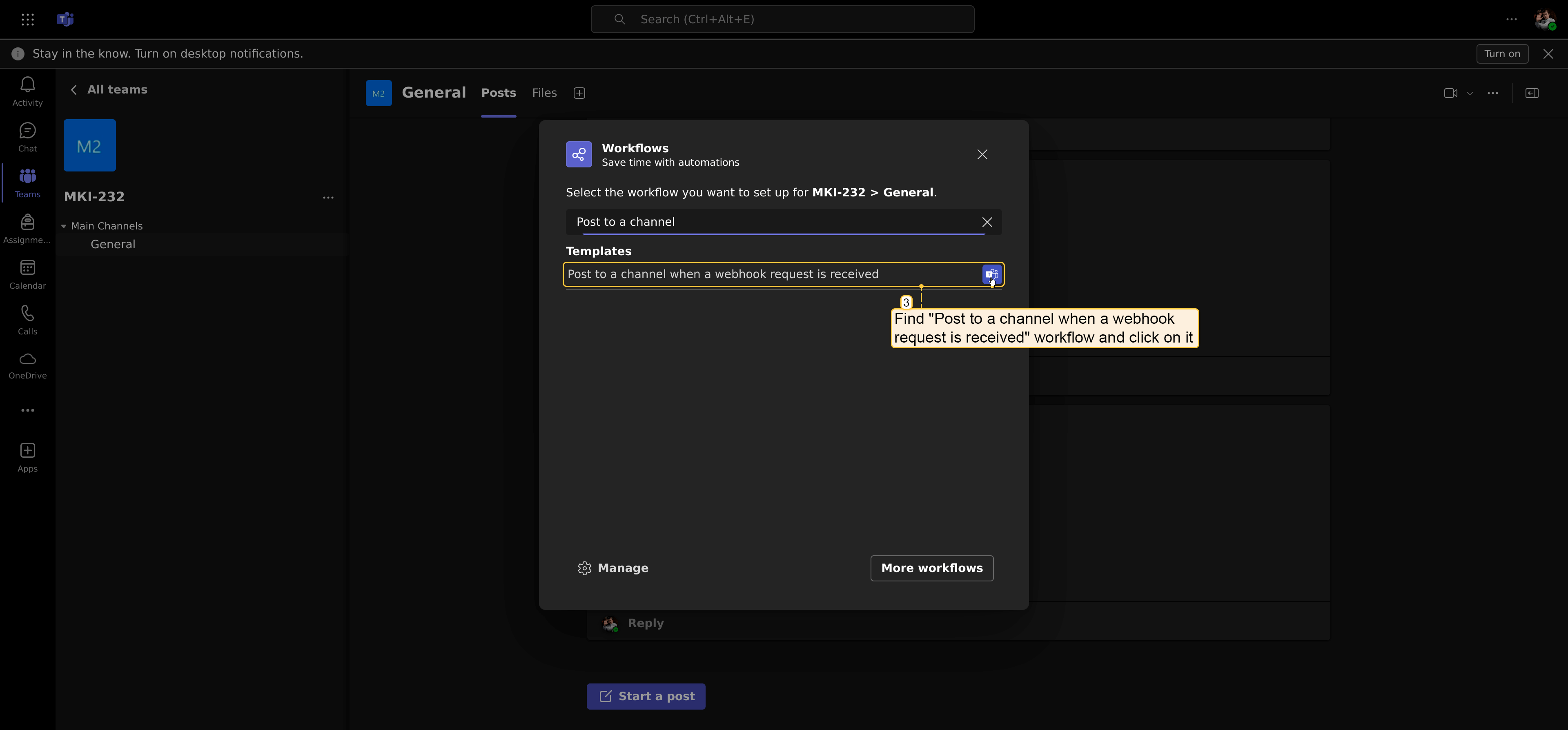 Find “Post to a channel when a webhook request is received” workflow and click on it;