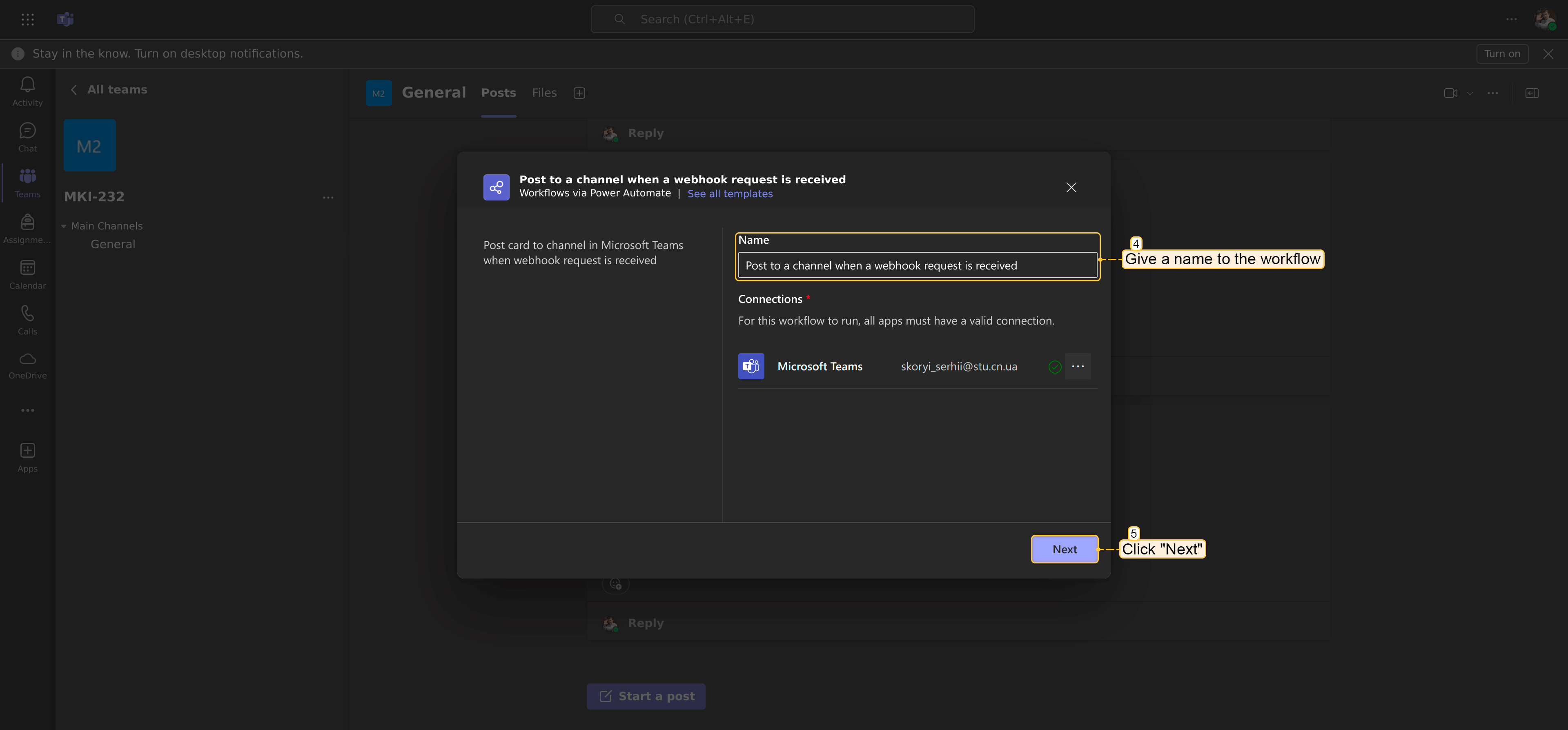 In the “Details” choose the team and the channel and click the “Add workflow” button;