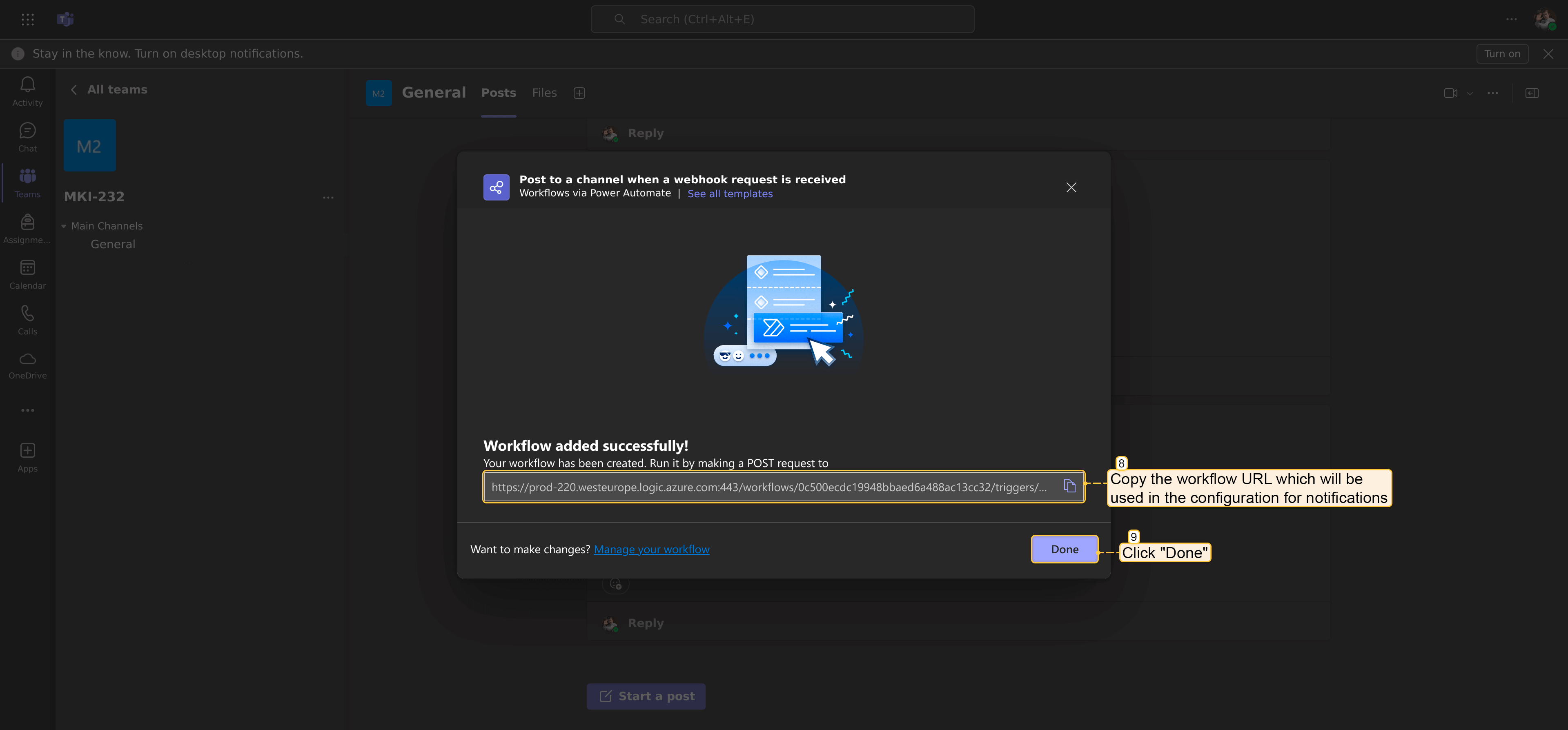 Workflow added successfully. Now, copy the workflow URL which will be used in the configuration for notifications. Finally, click the “Done” button.