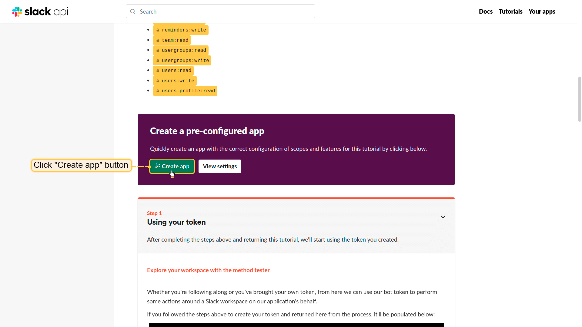 - In "How to quickly get and use a Slack API token" page, scroll below and find "Create a pre-configured app";