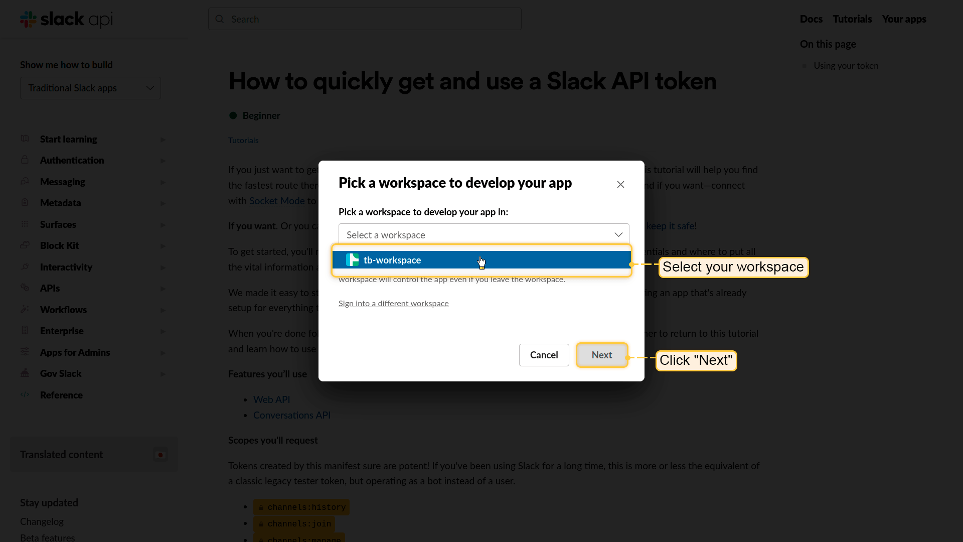 - In a new window, select your workspase from drop-down menu, then click "Next";
