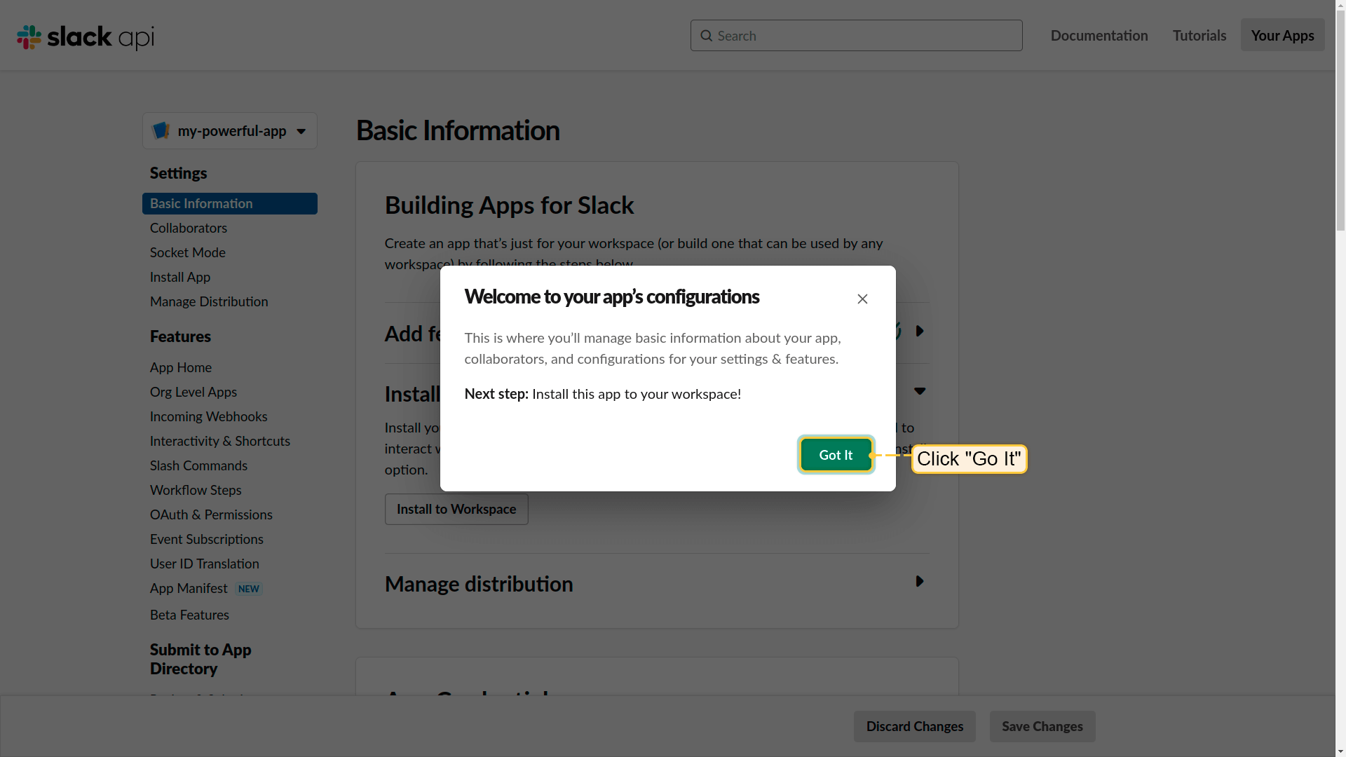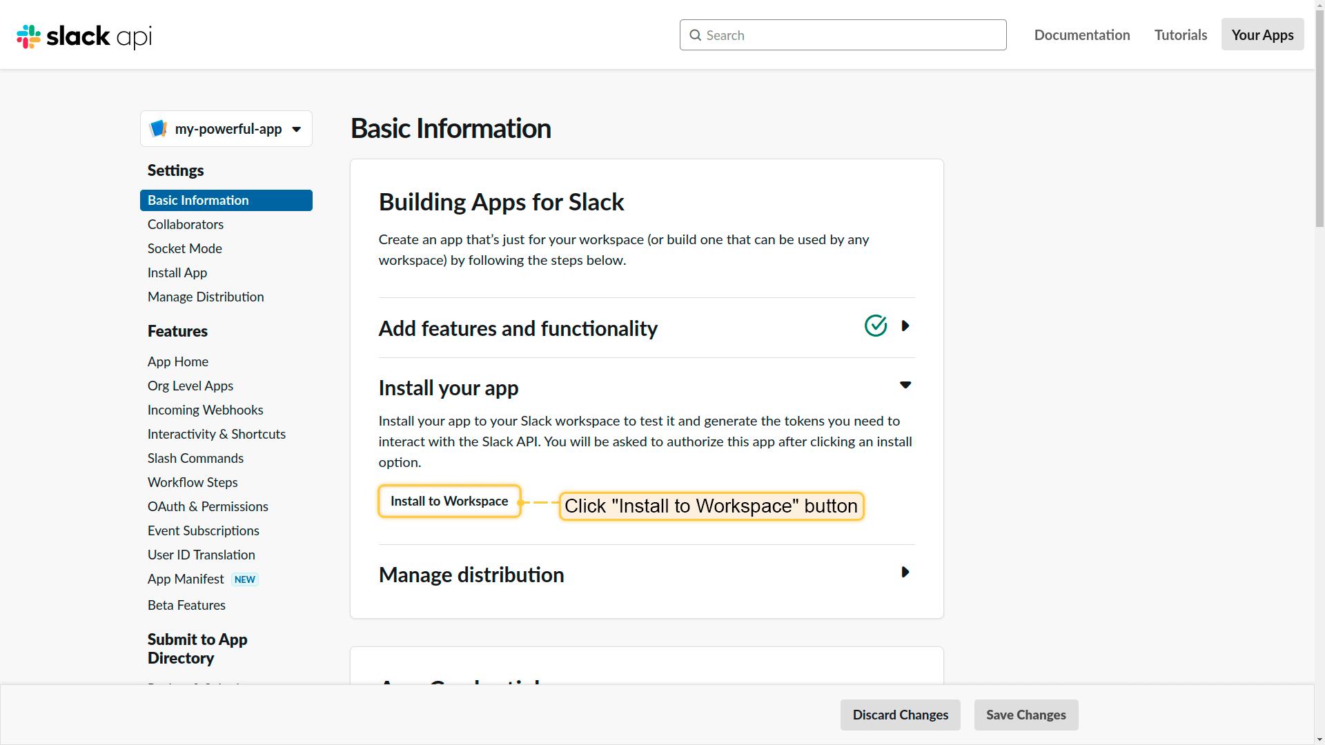 - Next step - install your app to your Slack workspace. Click "Install to Workspace" button;