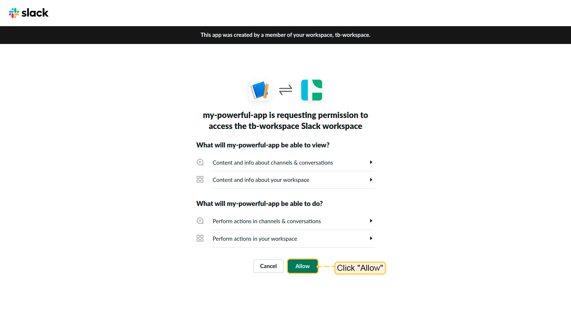 - App is requesting permission to access your Slack workspace. Click "Allow";