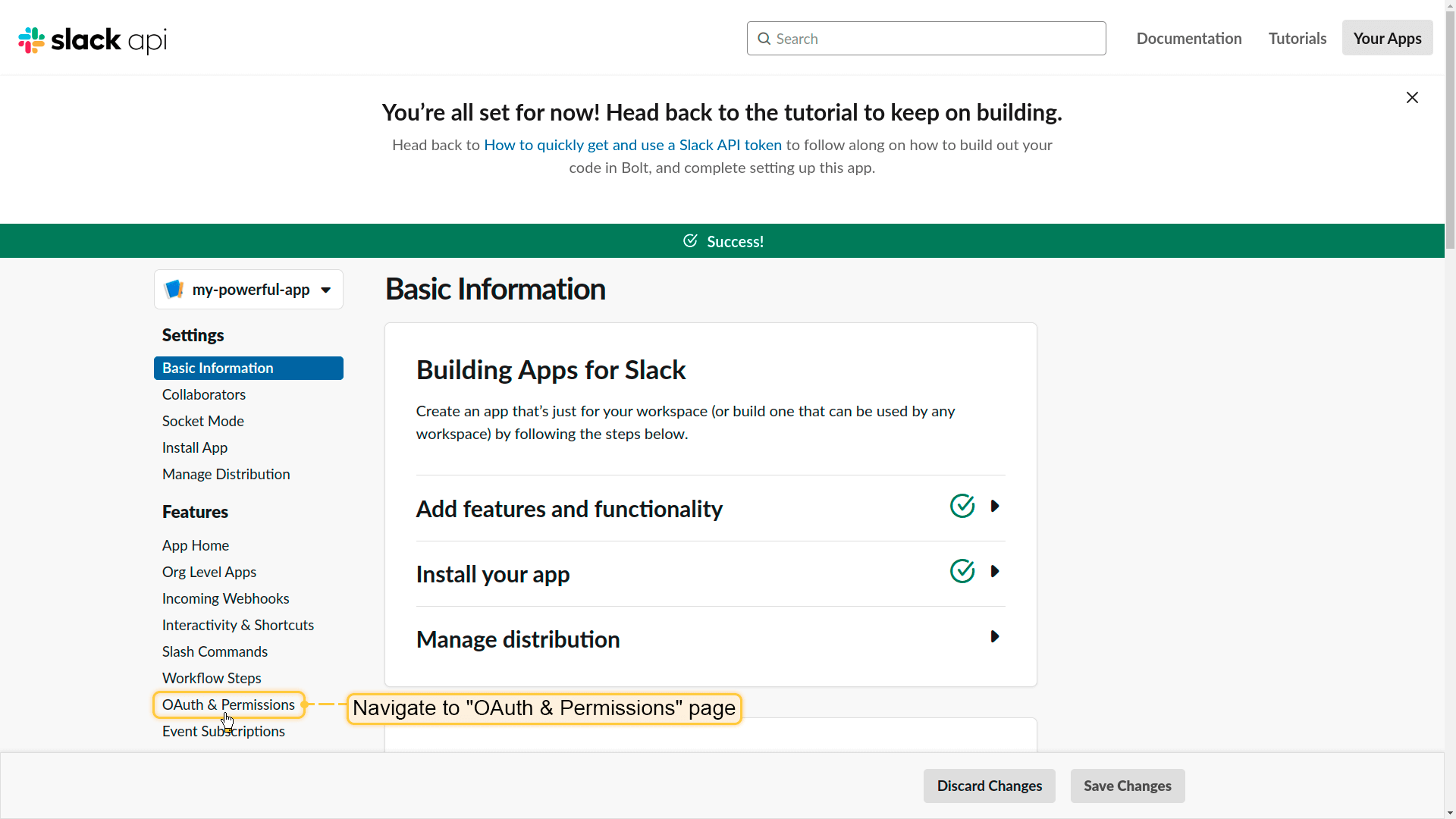 - Success! Your app is created. Now, navigate to "OAuth & Permissions" page;
