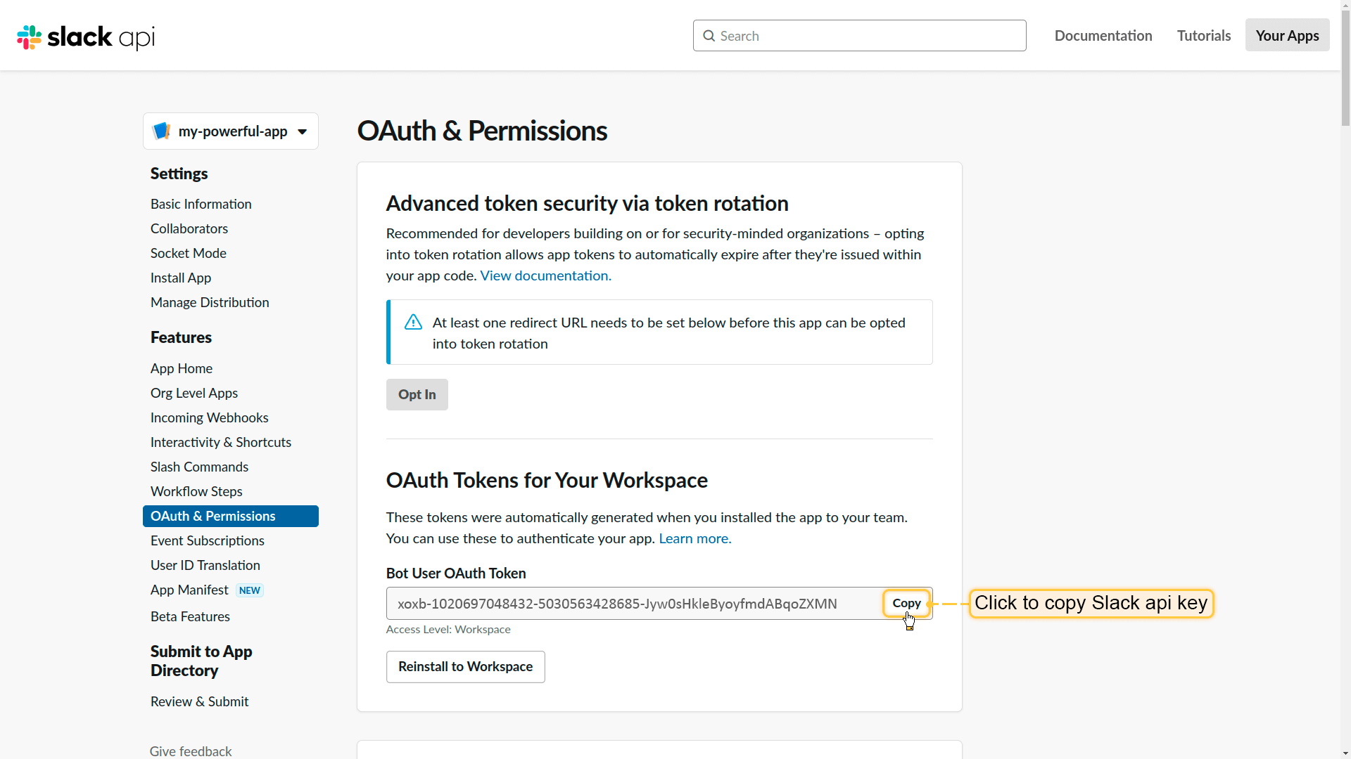 - Copy "Bot User OAuth Token". This is the "Slack API token" we need.