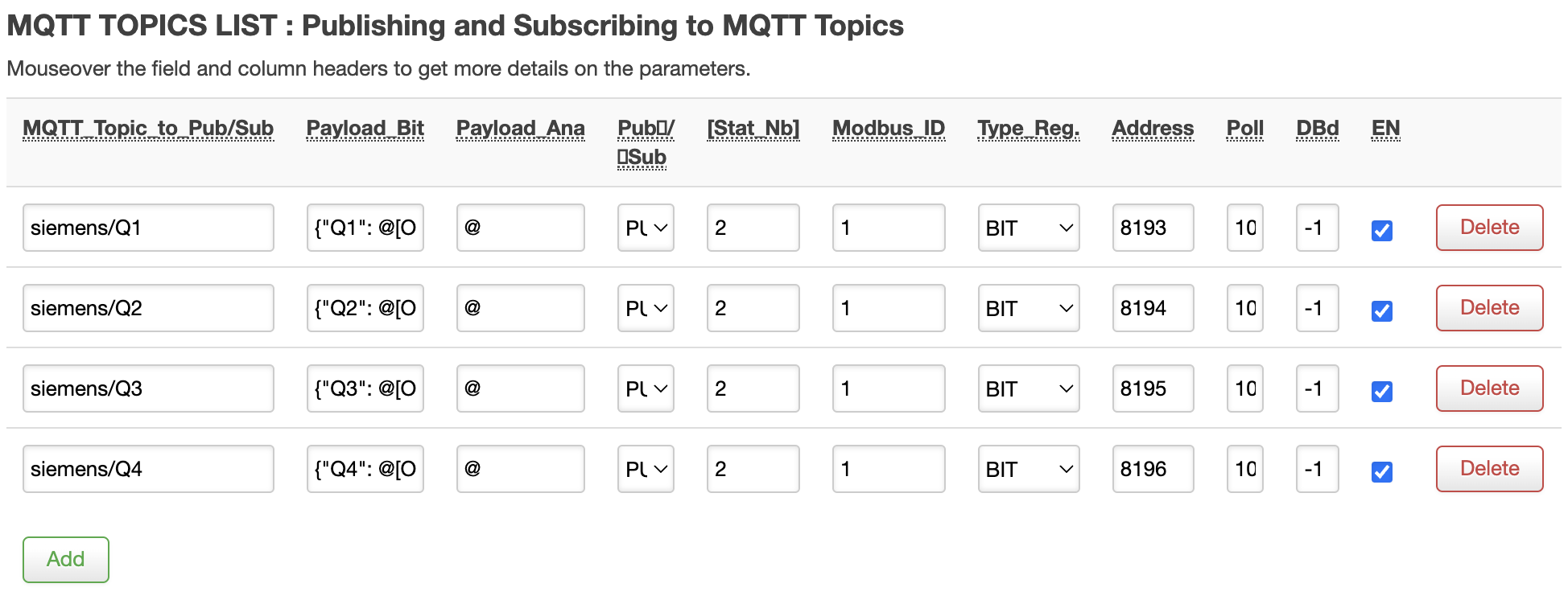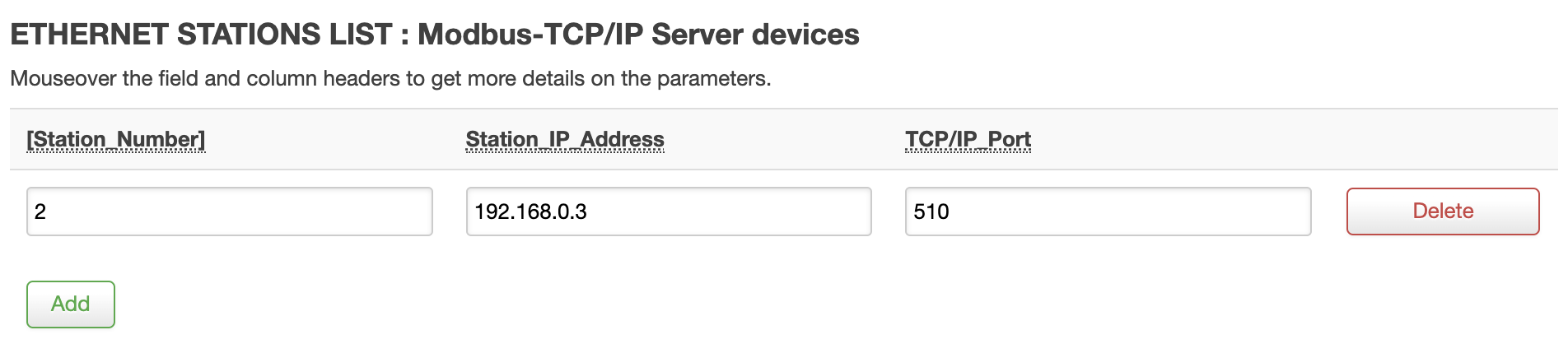 - Go to Gateway > MQTT Configuration > ETHERNET STATIONS LIST (under MQTT Broker section);