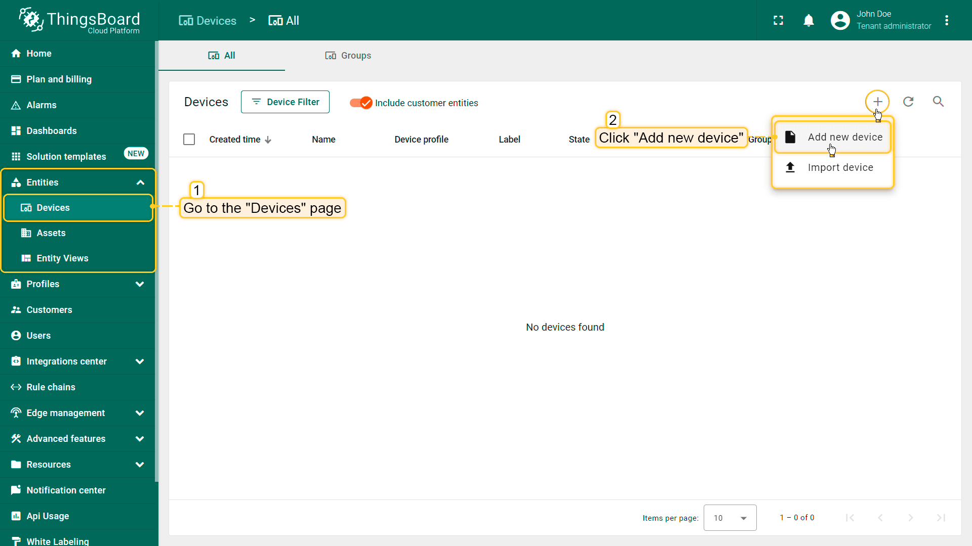 Open the Devices page. By default, you navigate to the device group “All”. Click on the “+” icon in the top right corner of the table and then select “Add new device”;