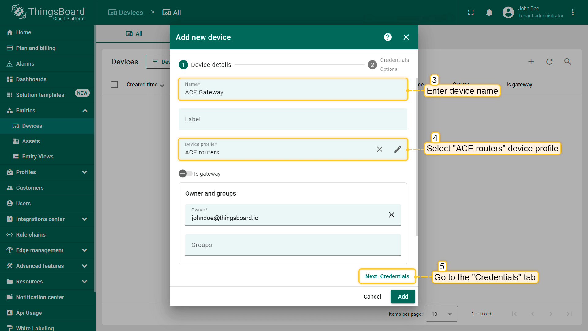Input device name. For example, “ACE Gateway”. Select created device profile from the step above, in our case, “ACE routers”;