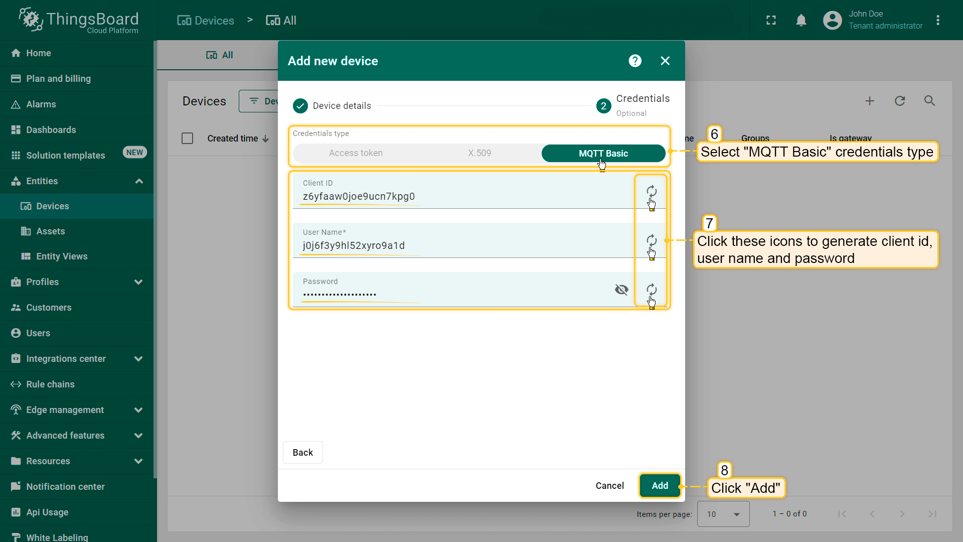 Click on “Credentials” tab. Check “Add credentials” and select “MQTT Basic” credentials type. Click on “Generate” button on each field. Click “Add” button;