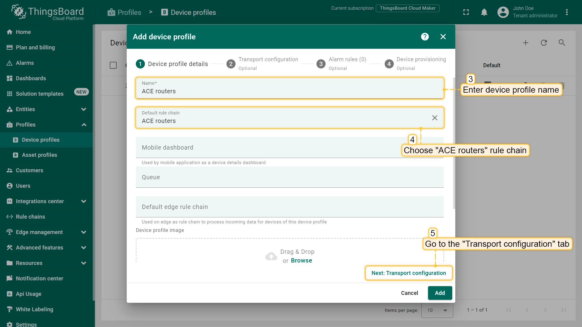 Go to Profiles > Device profiles and click on “Add” button > “Create new device profile”;