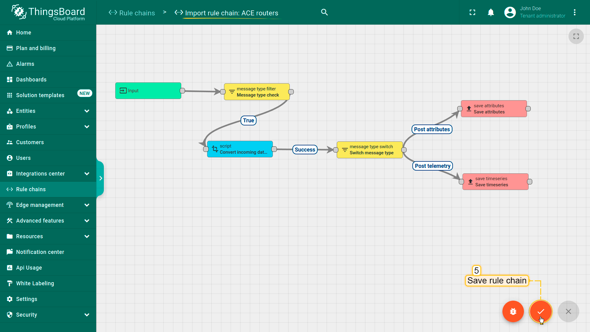 The imported rule chain will open. Click on the “Apply changes” button to save the rule chain. Then, go back to the main “Rule chains” page;